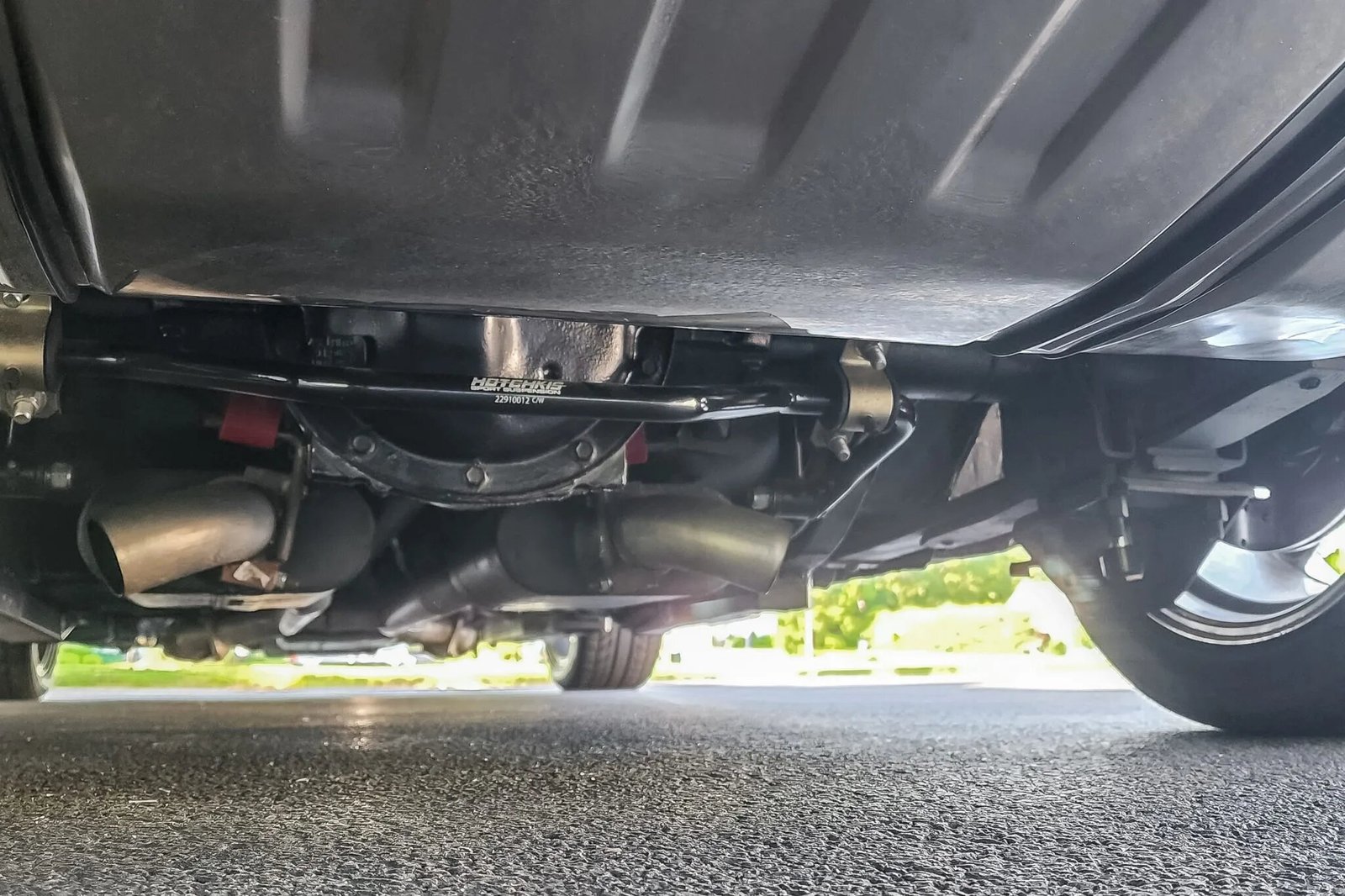 Equipment includes QA1 adjustable dampers, Wilwood power-assisted four-wheel disc brakes, and Hotchkis subframe connectors, tie rod ends, lowering springs, and front and rear sway bars.