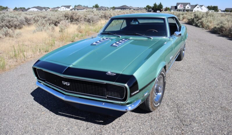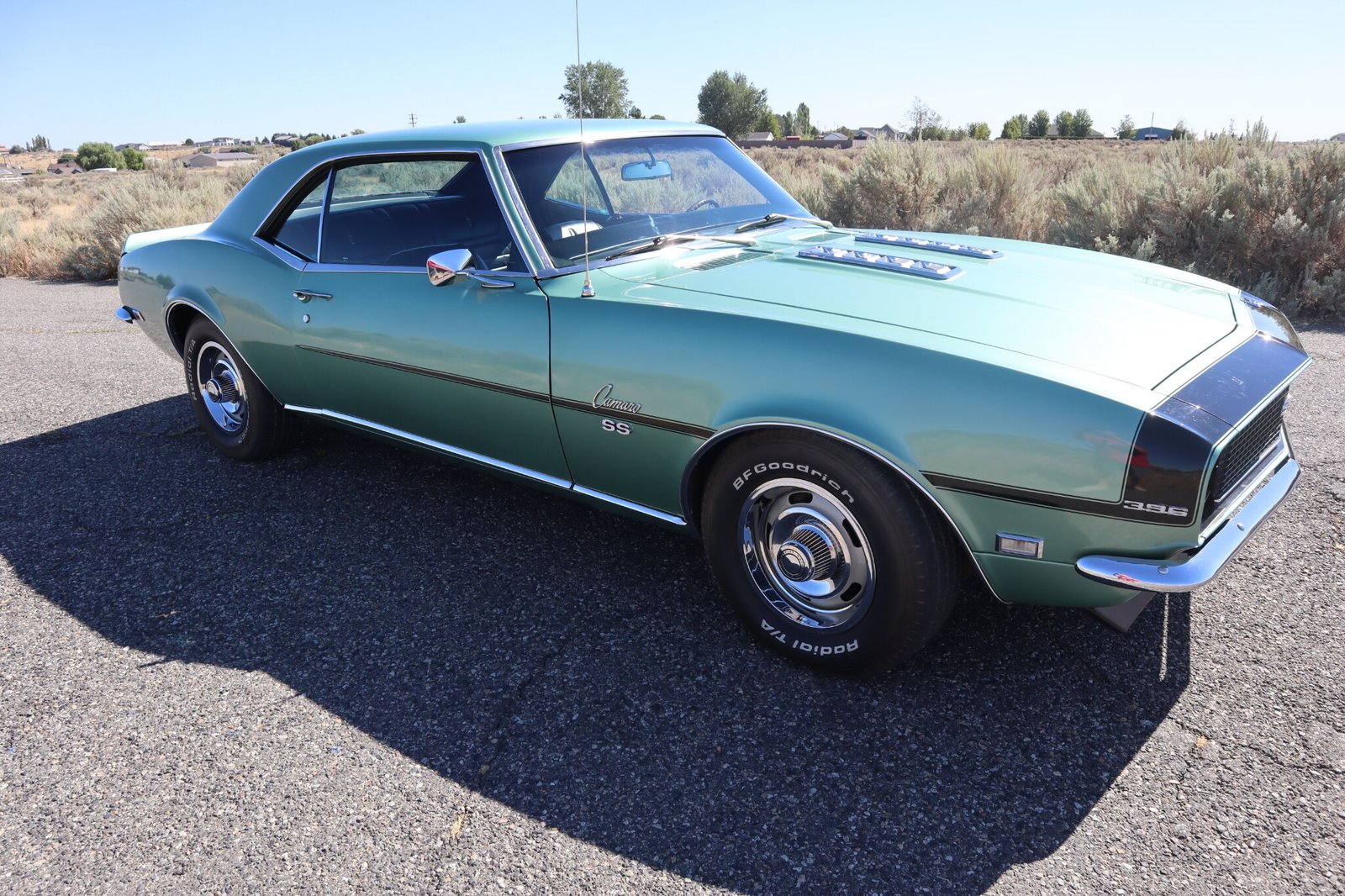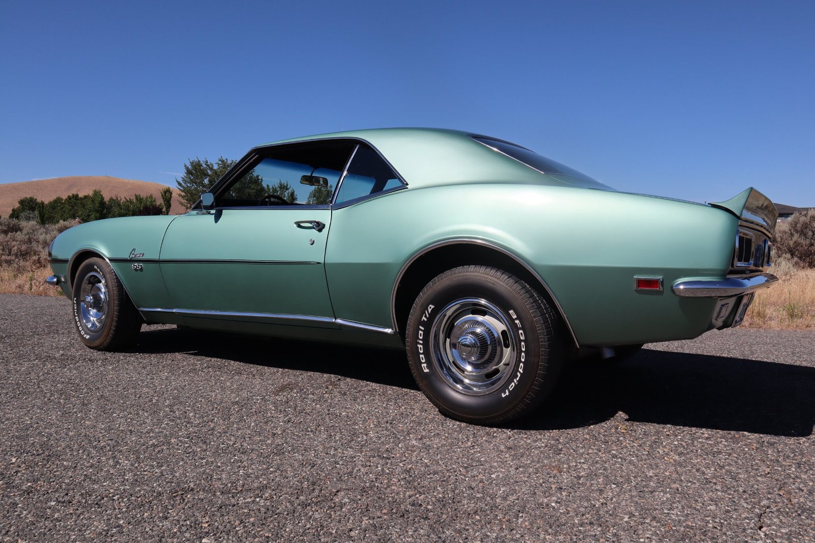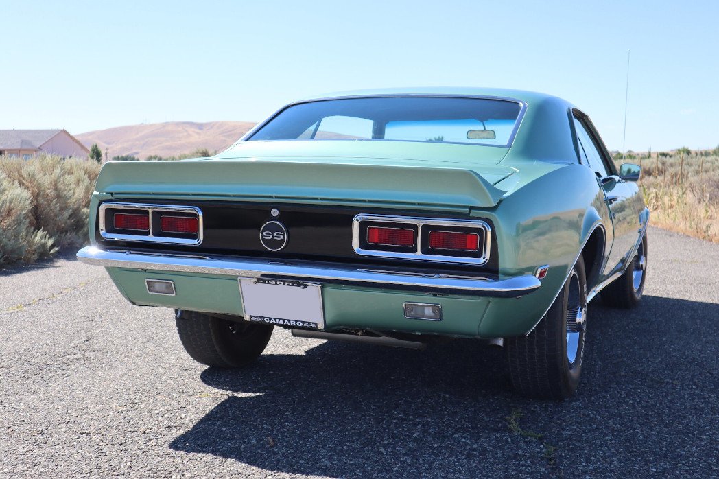 The body was refinished in its factory shade of Grecian Green (HH). Exterior features include a black “bumblebee” front stripe, a Rally Sport grille, front valance-mounted parking lights, reverse lights mounted in the rear valance, dual mirrors, and SS and 396 badging.