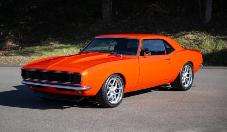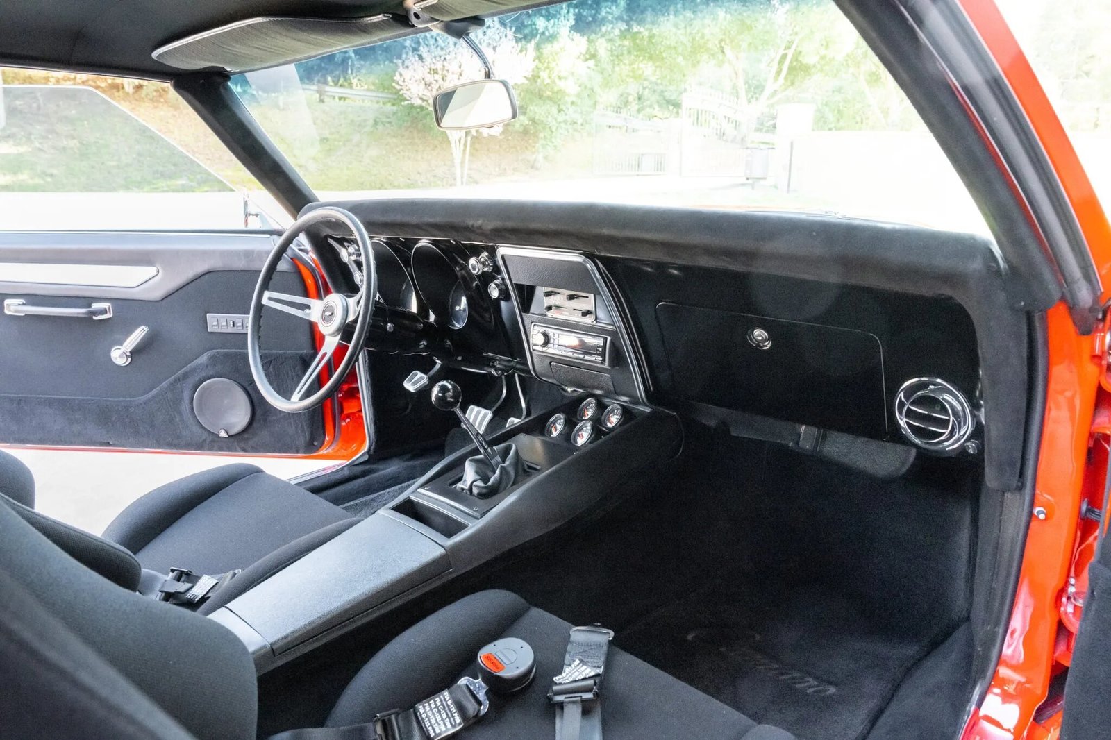 This 1968 Chevrolet Camaro is finished in orange with a yellow pearl ghost stripe over gray and powered by a 415ci V8 paired with a five-speed Tremec TKO 600 manual transmission and a 12-bolt Moser rear axle with a 3.42:1 Eaton Truetrac differential.