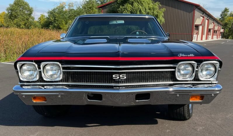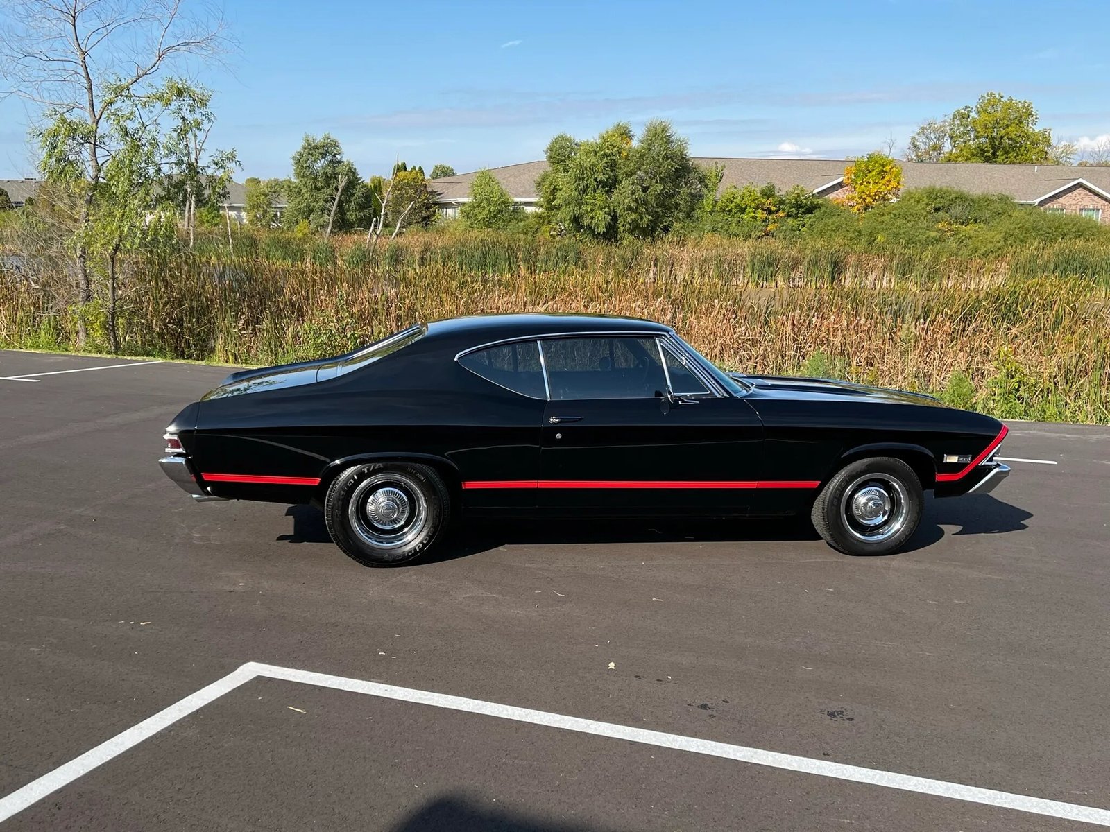 This 1968 Chevrolet Chevelle SS396 was subsequently repainted Tuxedo Black. Power is supplied by a replacement 396ci V8 mated to a four-speed manual transmission, and additional equipment includes a Positraction rear end, Flowmaster mufflers, 15” Rally-style wheels, red accent stripe graphics, power-assisted front disc brakes, a Hurst shifter, and an aftermarket stereo.