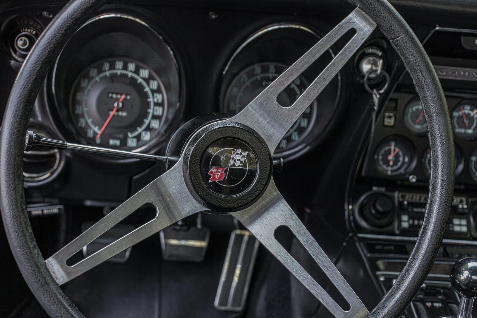 A three-spoke steering wheel fronts instrumentation that includes a 160-mph speedometer and a tachometer with a 5,650-rpm redline, while the center stack houses auxiliary gauges measuring oil pressure, coolant temperature, amperage, and fuel level.