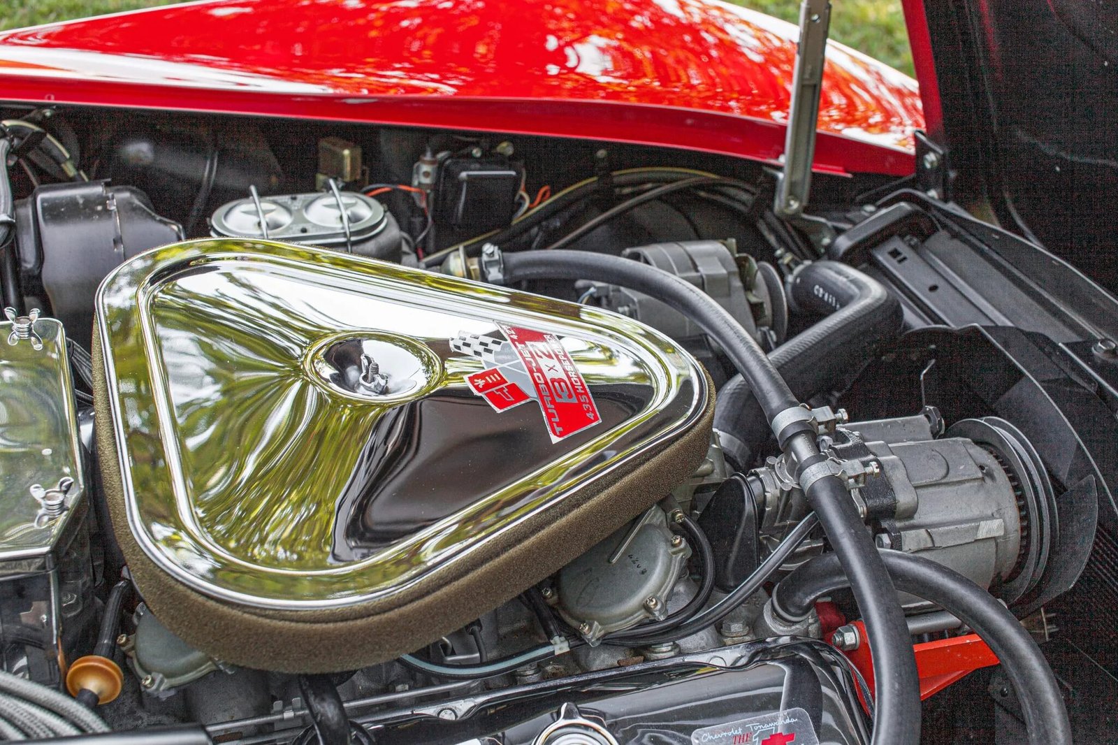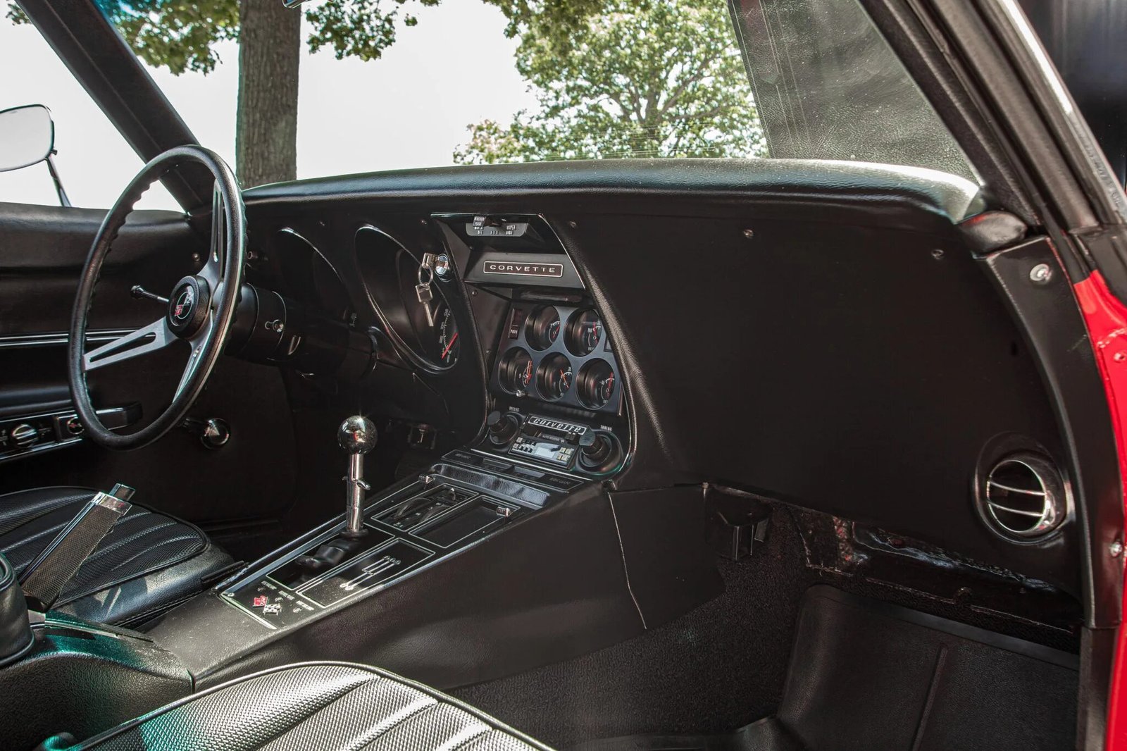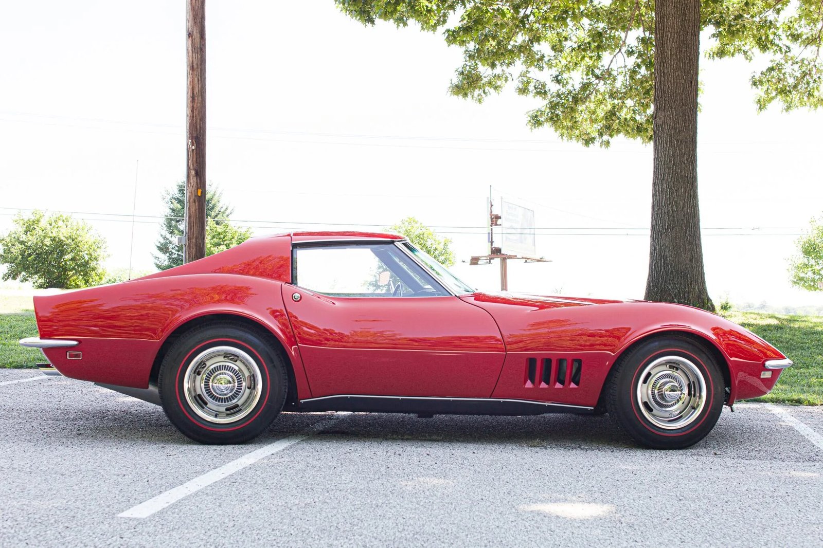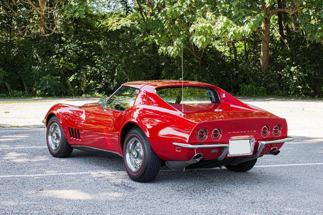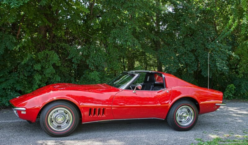 This 1968 Chevrolet Corvette coupe is finished in red over black vinyl and is powered by a 427ci V8 paired with a four-speed manual transmission.