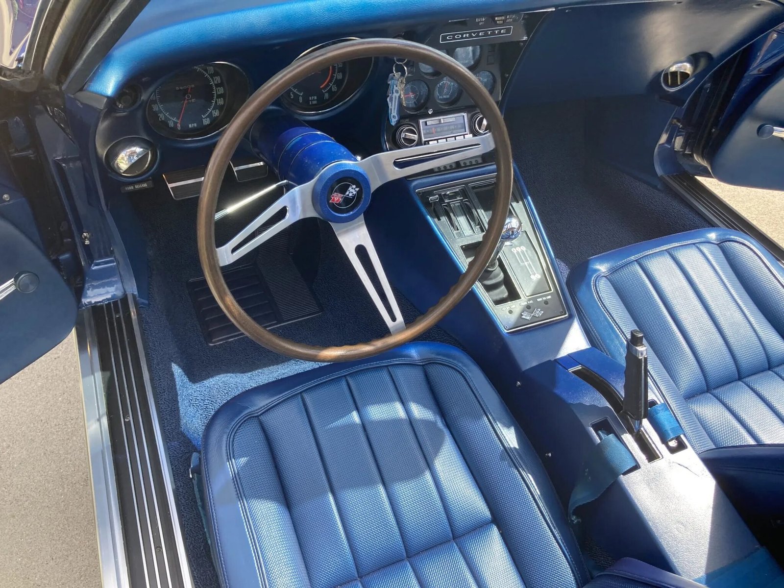 The seats are said to have been re-trimmed in blue vinyl under prior ownership and are joined by a blue dashboard, door panels, and carpets protected by Stingray-branded floor mats.