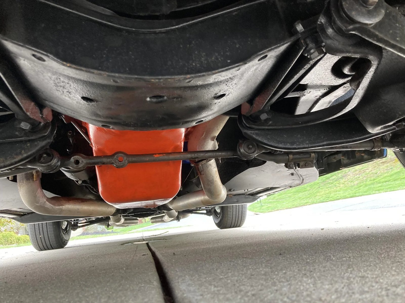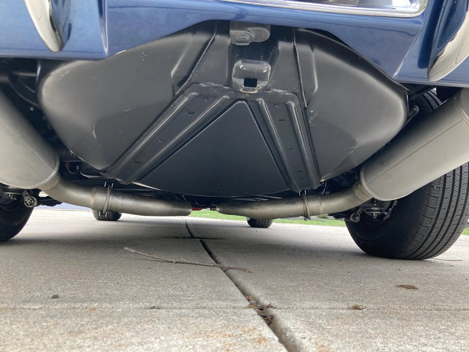 Rallye-style 15″ wheels feature chrome trim rings and hubcaps and are mounted with 215/70 Diamond Back redline tires that were installed in February 2025.