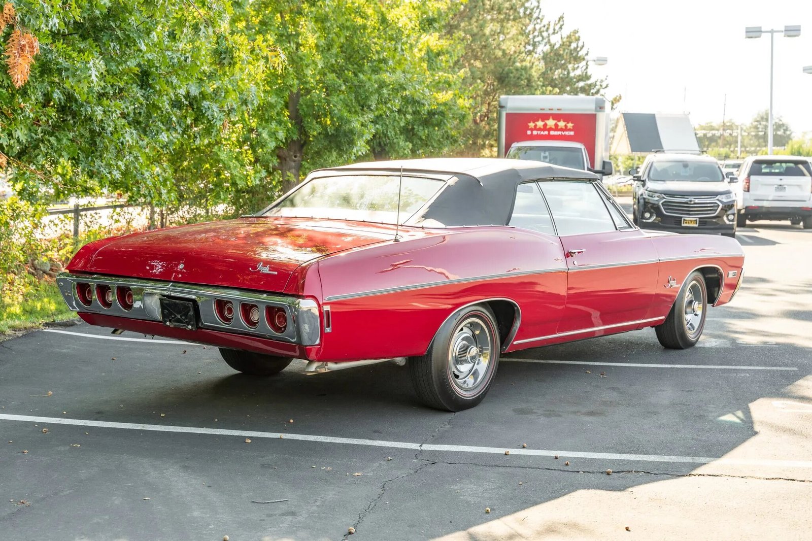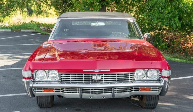 This 1968 Chevrolet Impala SS427 convertible is powered by a 427ci V8 mated to a TH400 three-speed automatic transmission and a 12-bolt rear axle and is finished in red over black vinyl upholstery. Equipment includes a power-operated black convertible top, power steering, power brakes, 15″ Rally wheels, a center console, bucket seats, and a push-button radio.