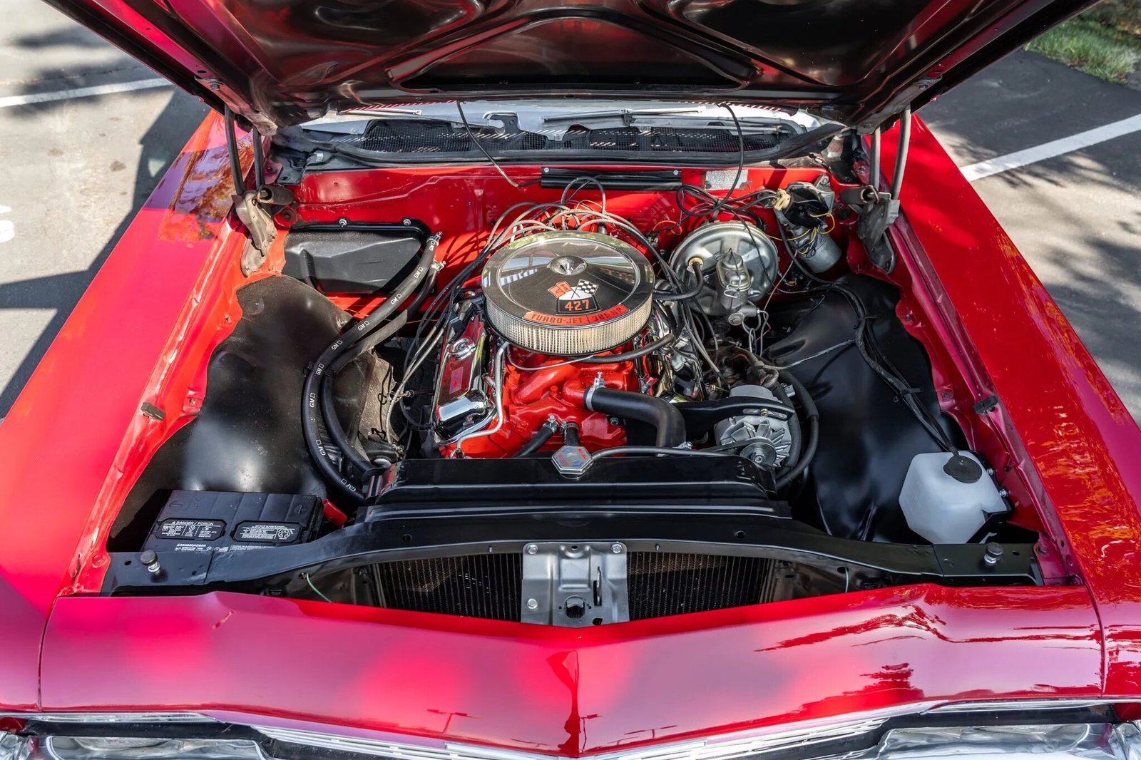 The 427ci V8 features a four-barrel carburetor, a chrome air cleaner lid and valve covers, and an orange engine block and intake manifold. Power is delivered to the rear wheels through a TH400 three-speed automatic transmission and a 12-bolt rear axle.