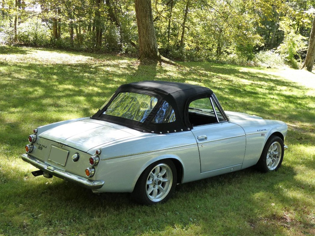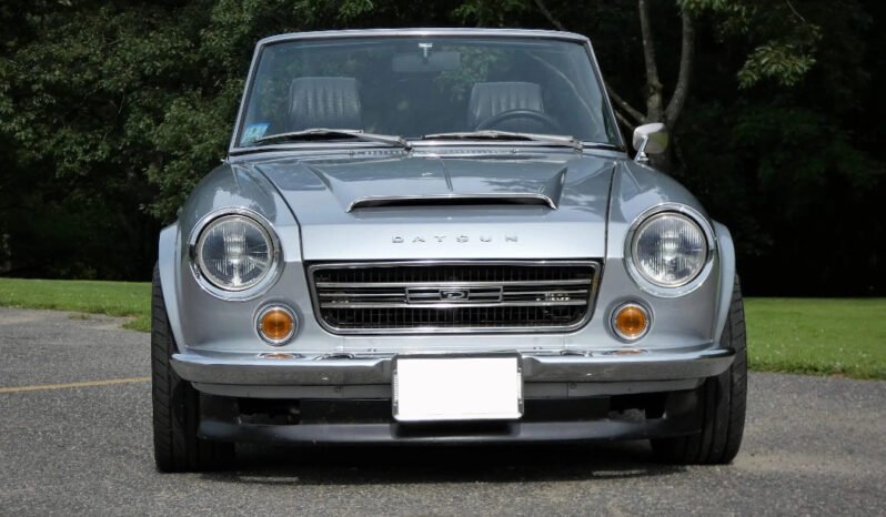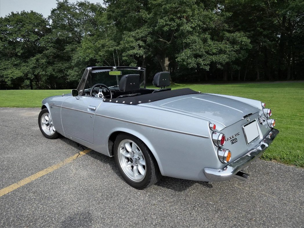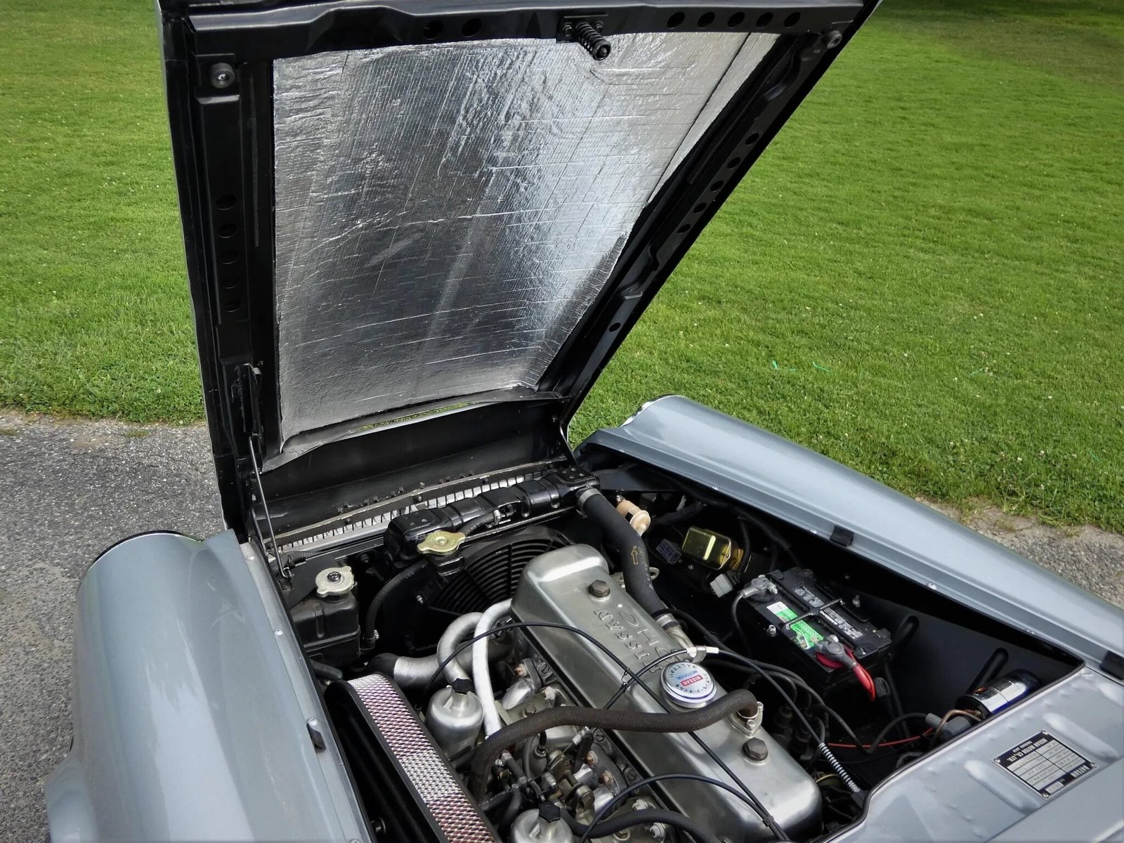 Work included rebuilding the 2.0L inline-four, five-speed manual transmission, and SU carburetors, reworking and refinishing the bodywork in silver, painting the frame, reupholstering the interior, replacing the black soft top, and overhauling the brakes and suspension.