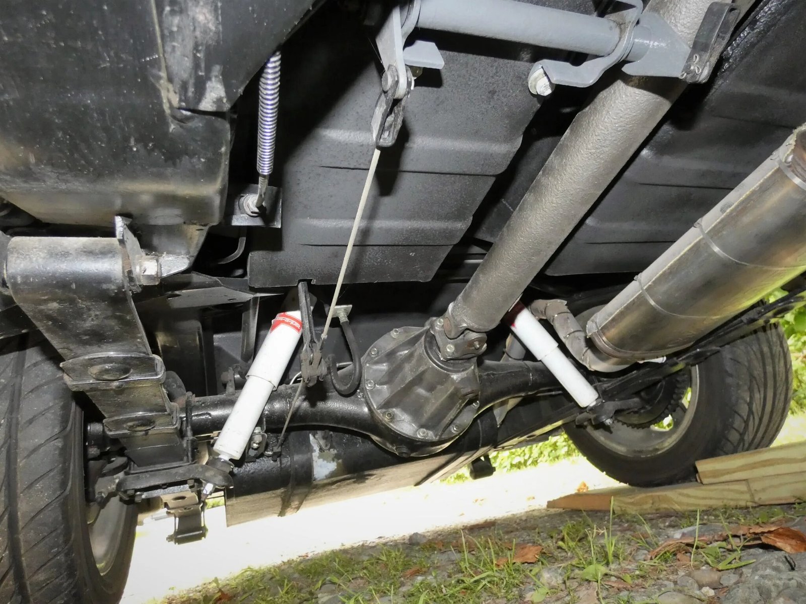 The suspension was overhauled during the refurbishment with re-bushed leaf springs, stiffer lowering coil springs, and new urethane bushings and boots.