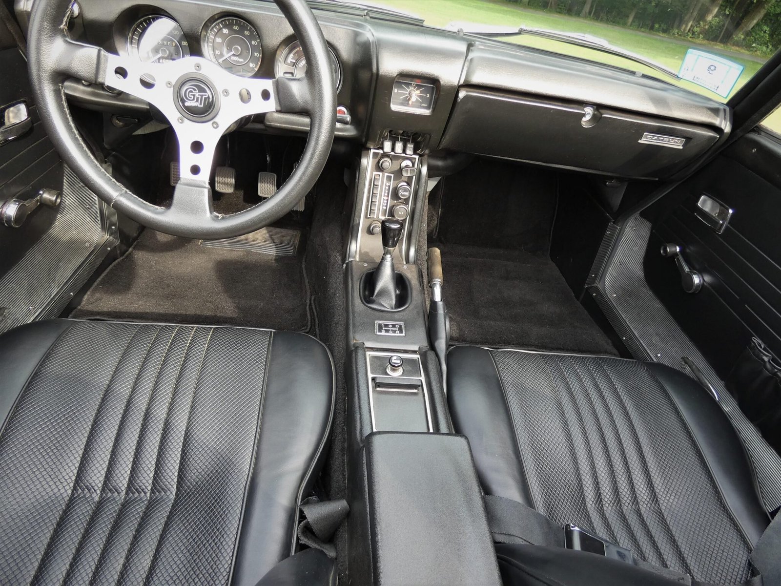 The seats were rebuilt with replacement webbing and black vinyl covers, and interior equipment includes lap belts, an analog clock, and a vertically-mounted Toshiba AM radio.