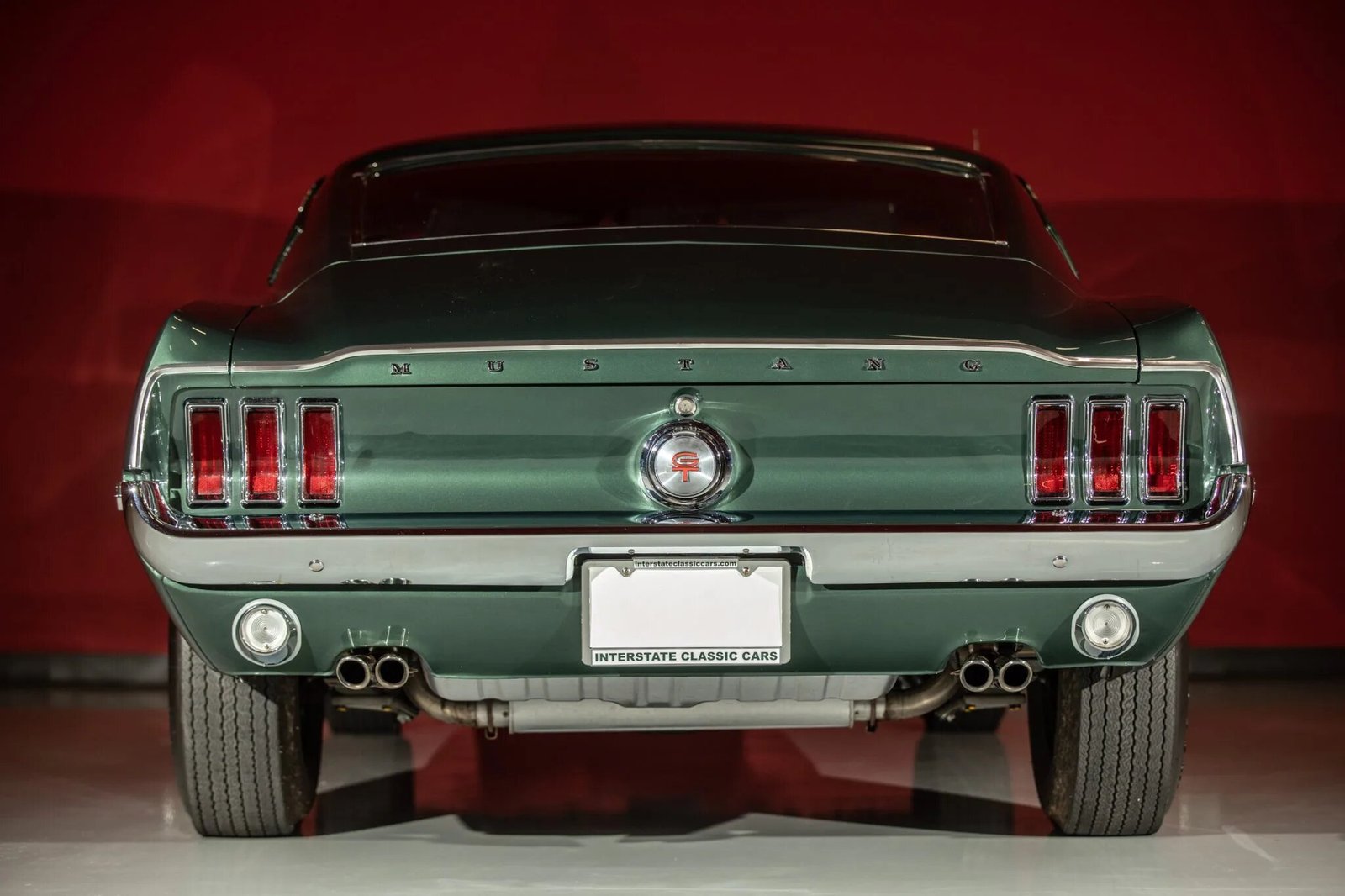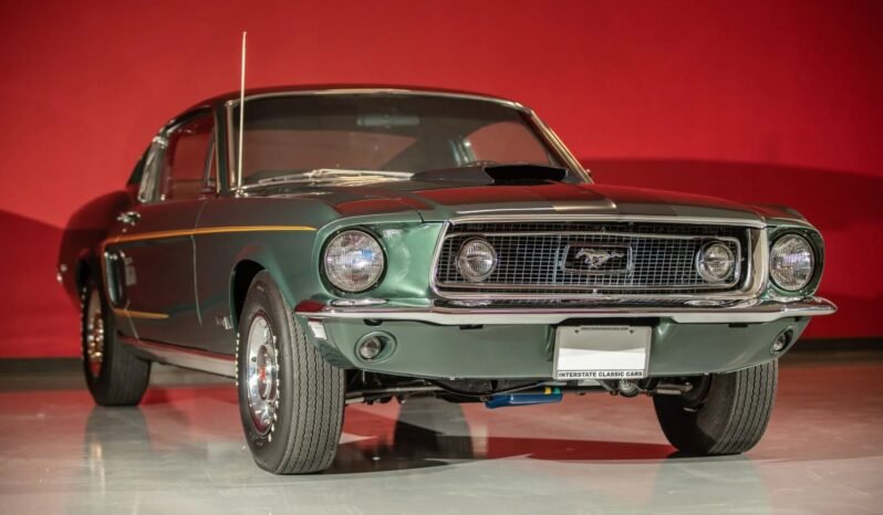 The car have been refinished in the factory Highland Green (R), features include a hood scoop, black hood stripe, gold C-stripes, a grille with integrated fog lights, GT badging, and dual exhaust outlets exiting below the rear valance.