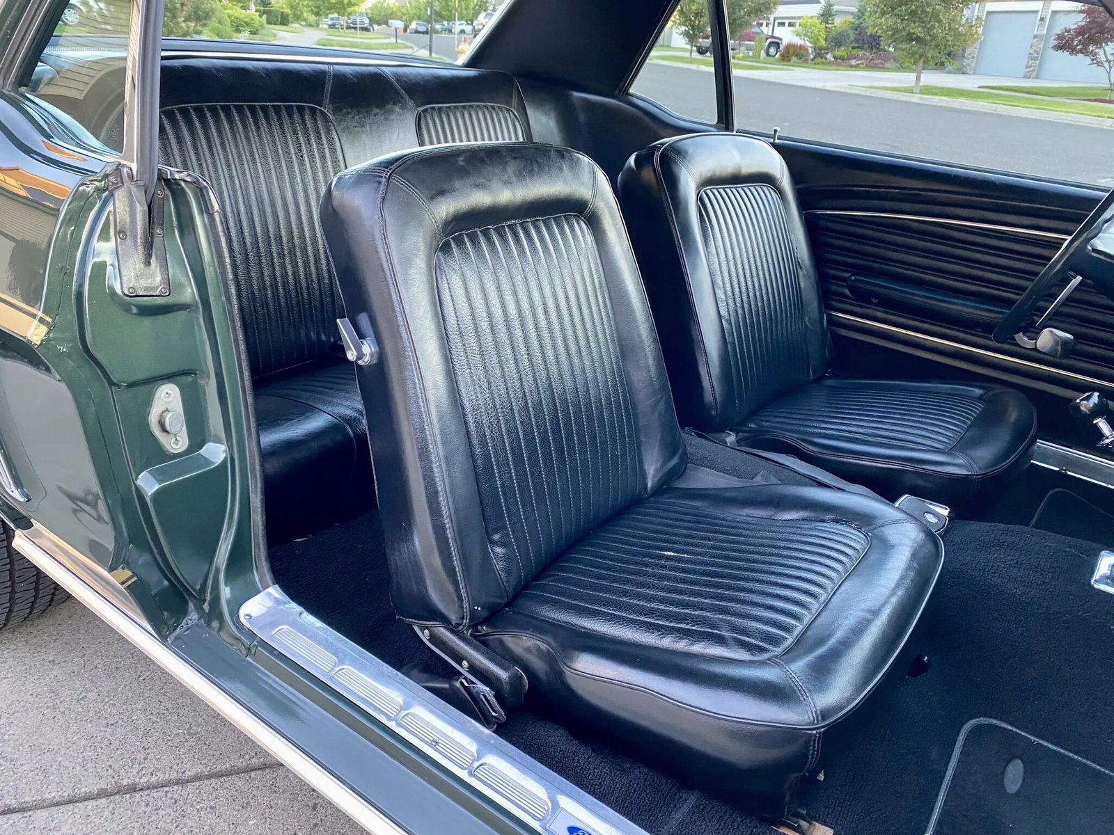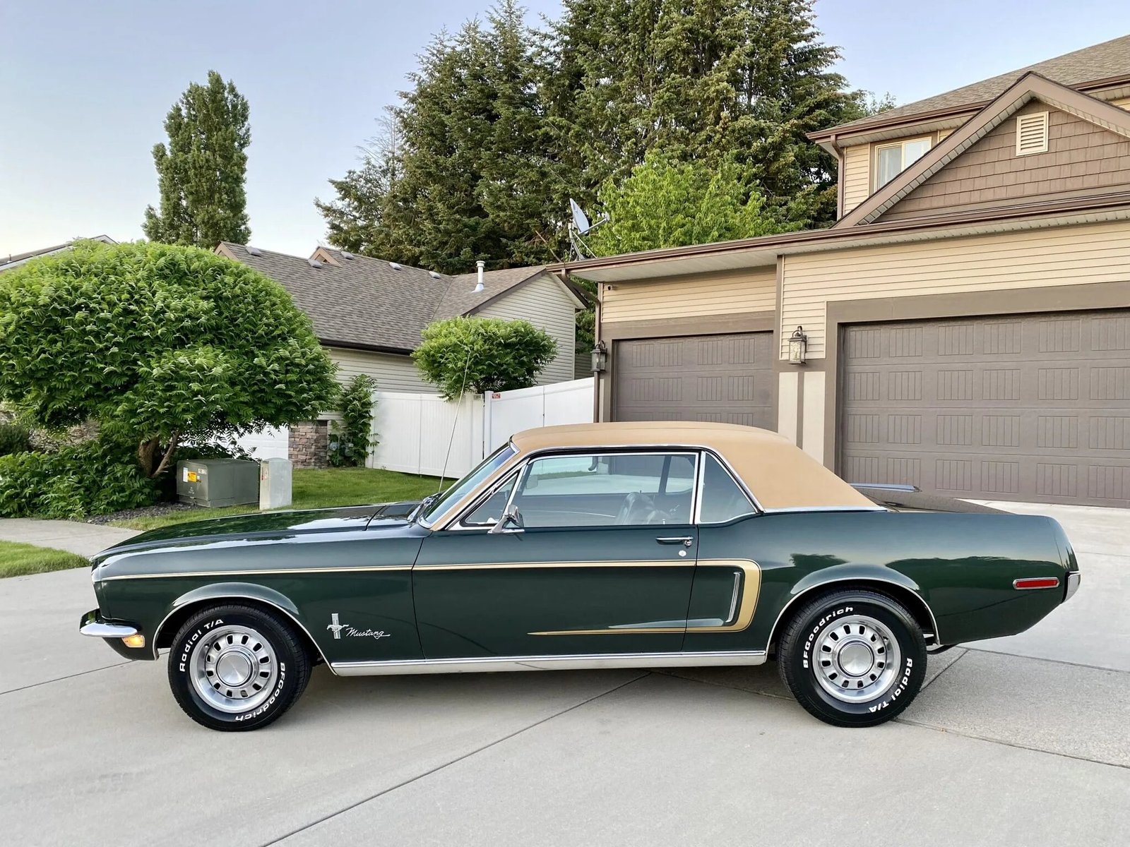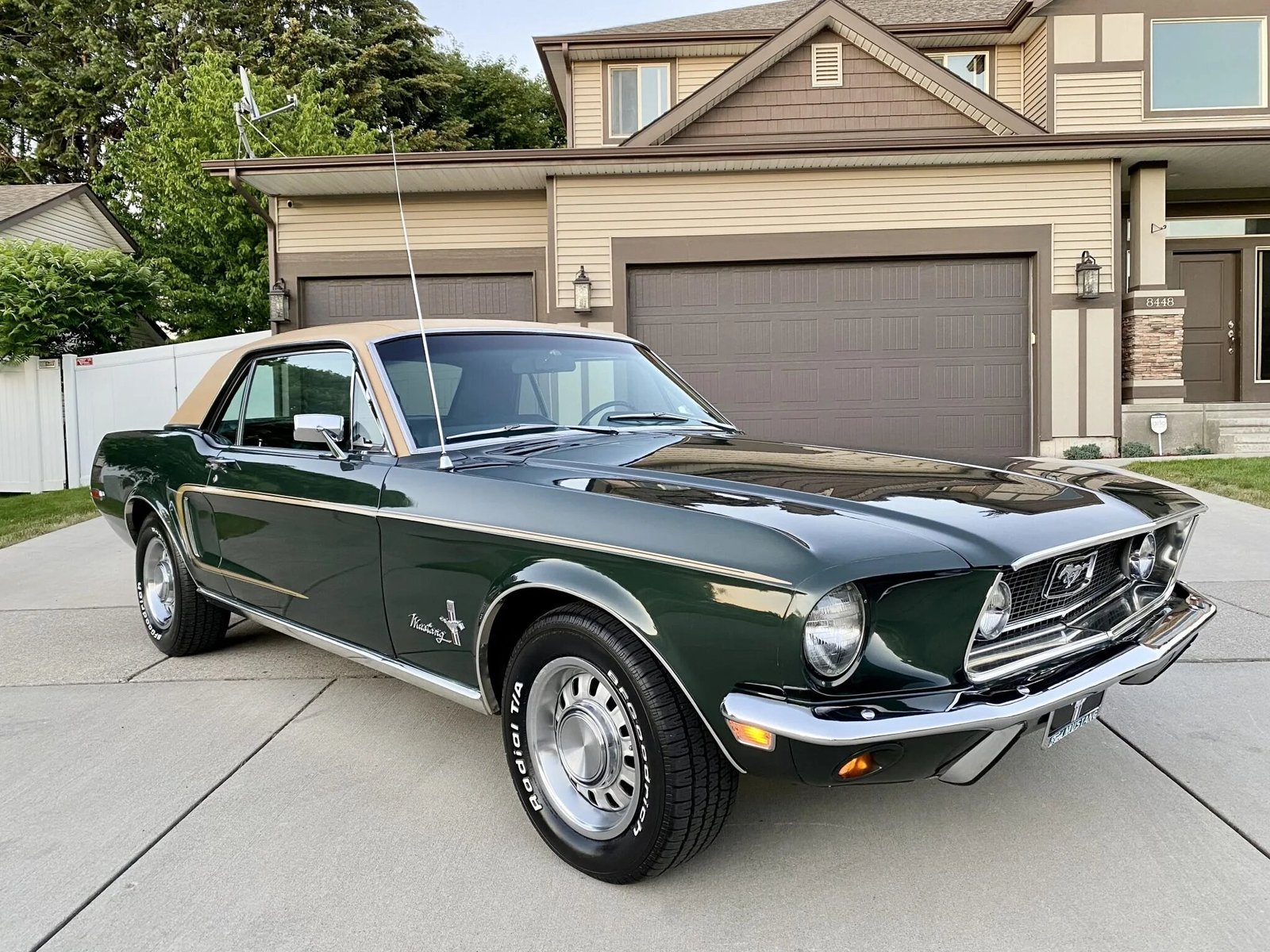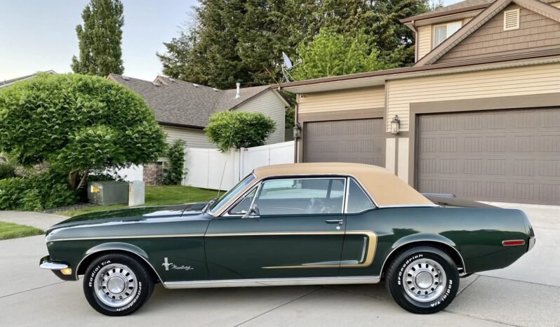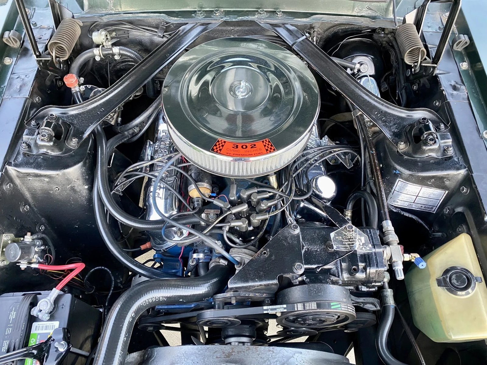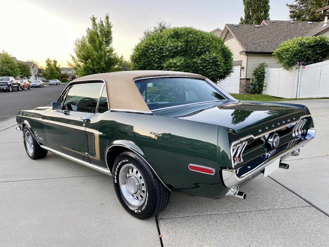 The car is finished in Highland Green with gold stripes over black vinyl upholstery and is powered by a 302ci V8 paired with a four-speed manual transmission.