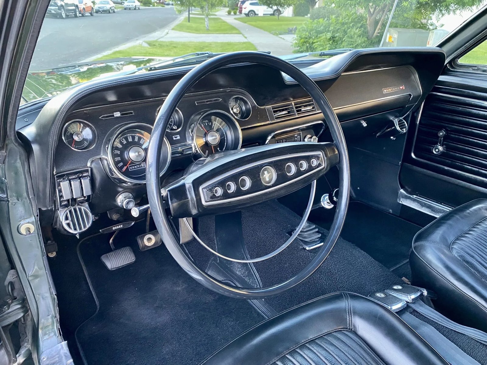 The two-spoke steering wheel has a horn ring and frames a 120-mph speedometer, a tachometer, and gauges for fuel level and coolant temperature.