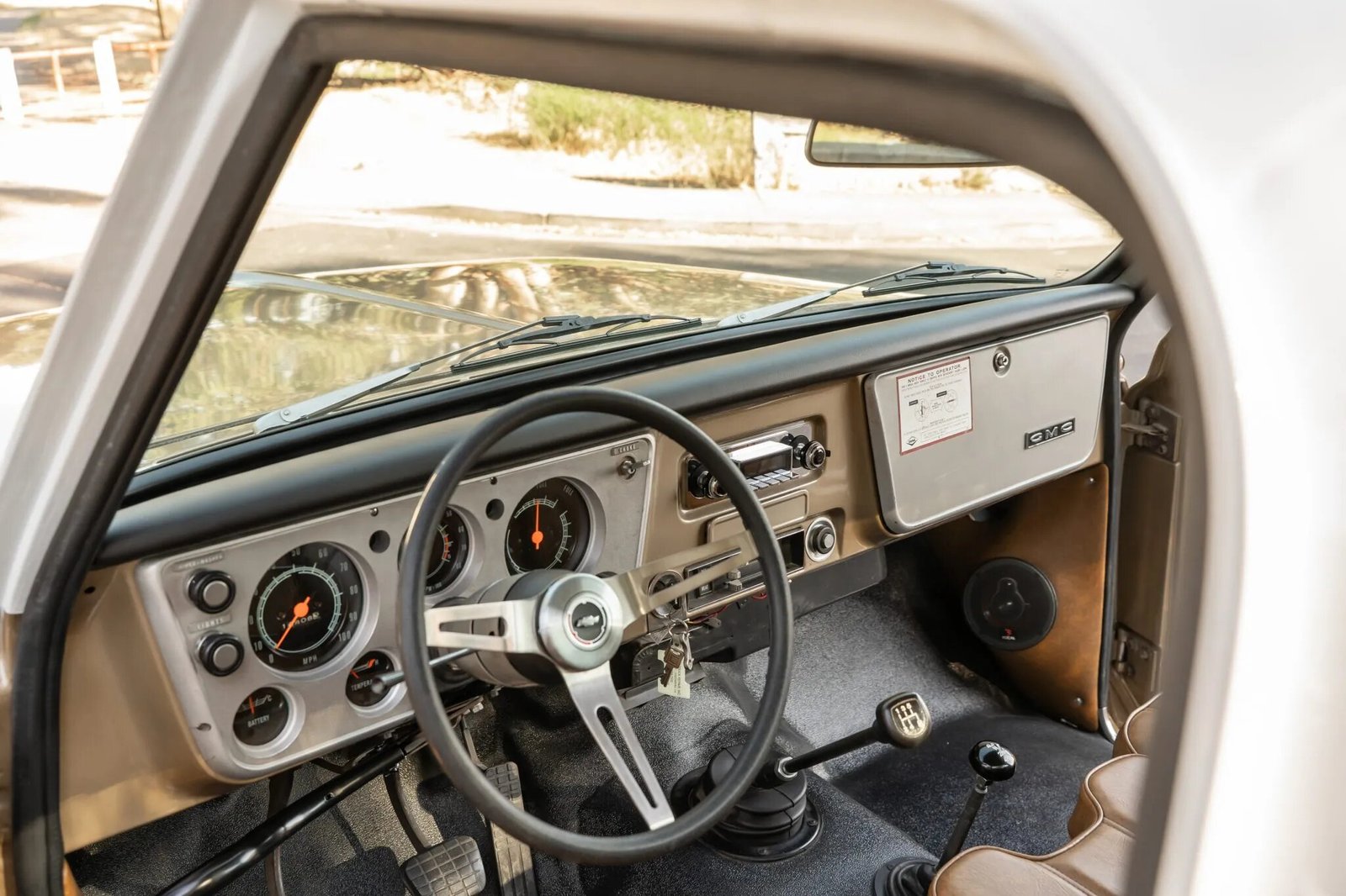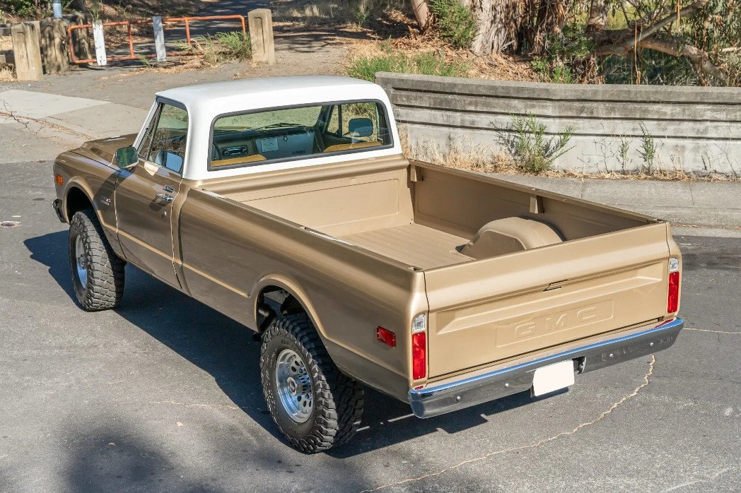 This 1968 GMC K2500 pickup was refurbished and modified. Work have consisted of refinishing the body in metallic gold and white, reupholstering the cabin in tan vinyl, rebuilding and installing a 350ci V8, and installing an NV4500 five-speed manual transmission and an NP205 dual-range transfer case. Other equipment includes Dana 44 front and Dana 60 rear differentials, American Racing 16″ wheels, BFGoodrich 33″ tires, front disc brakes, a lifted suspension, Rancho shocks, a PSC power-steering box, a custom dual exhaust system, a 19-gallon fuel tank, heated seats, and a RetroSound stereo.