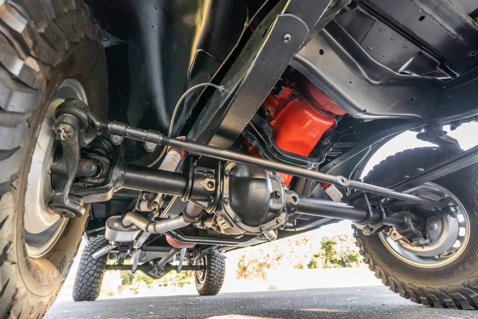 American Racing 16″ aluminum wheels are wrapped in 285/75 BFGoodrich Mud-Terrain T/A KM3 tires, and manually locking Warn hubs are fitted up front. The truck is equipped with a Performance Steering Components billet power-steering box, and a 2″ suspension lift utilizes Rancho shocks, replacement leaf springs, and Offroad Designs shackles and polyurethane bushings. Braking is handled by front discs and rear drums with stainless-steel lines and a Classic Performance Products booster. The steering, front brakes, and front differential have been sourced from a third-generation ¾-ton GM Squarebody truck.