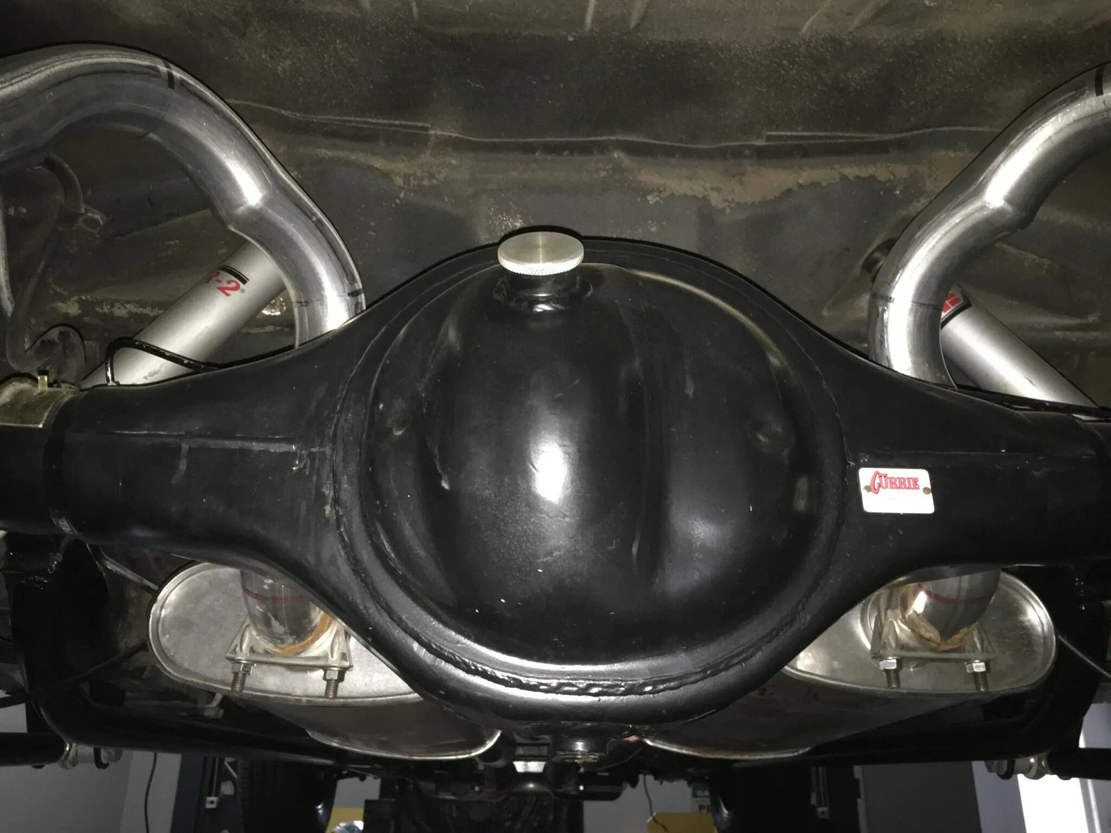 Power is sent to the rear wheels through an overhauled replacement C6 three-speed automatic transmission as well as a custom 31-spline Currie 9″ limited-slip differential with Torsen 3.00:1 gears.