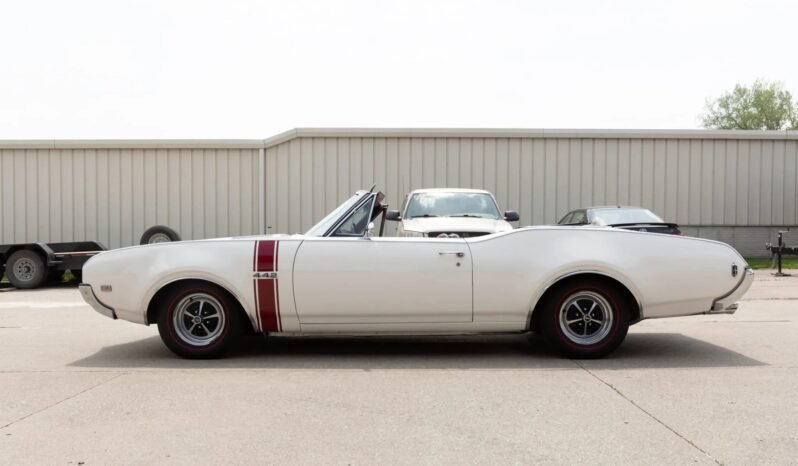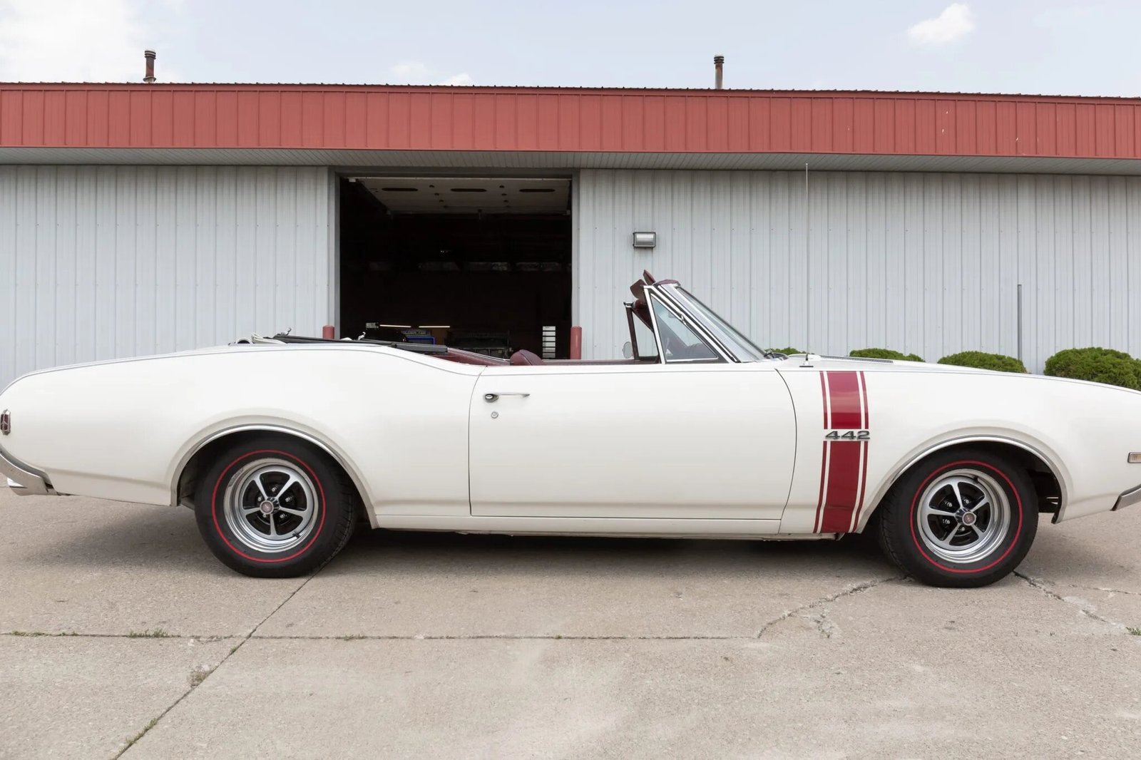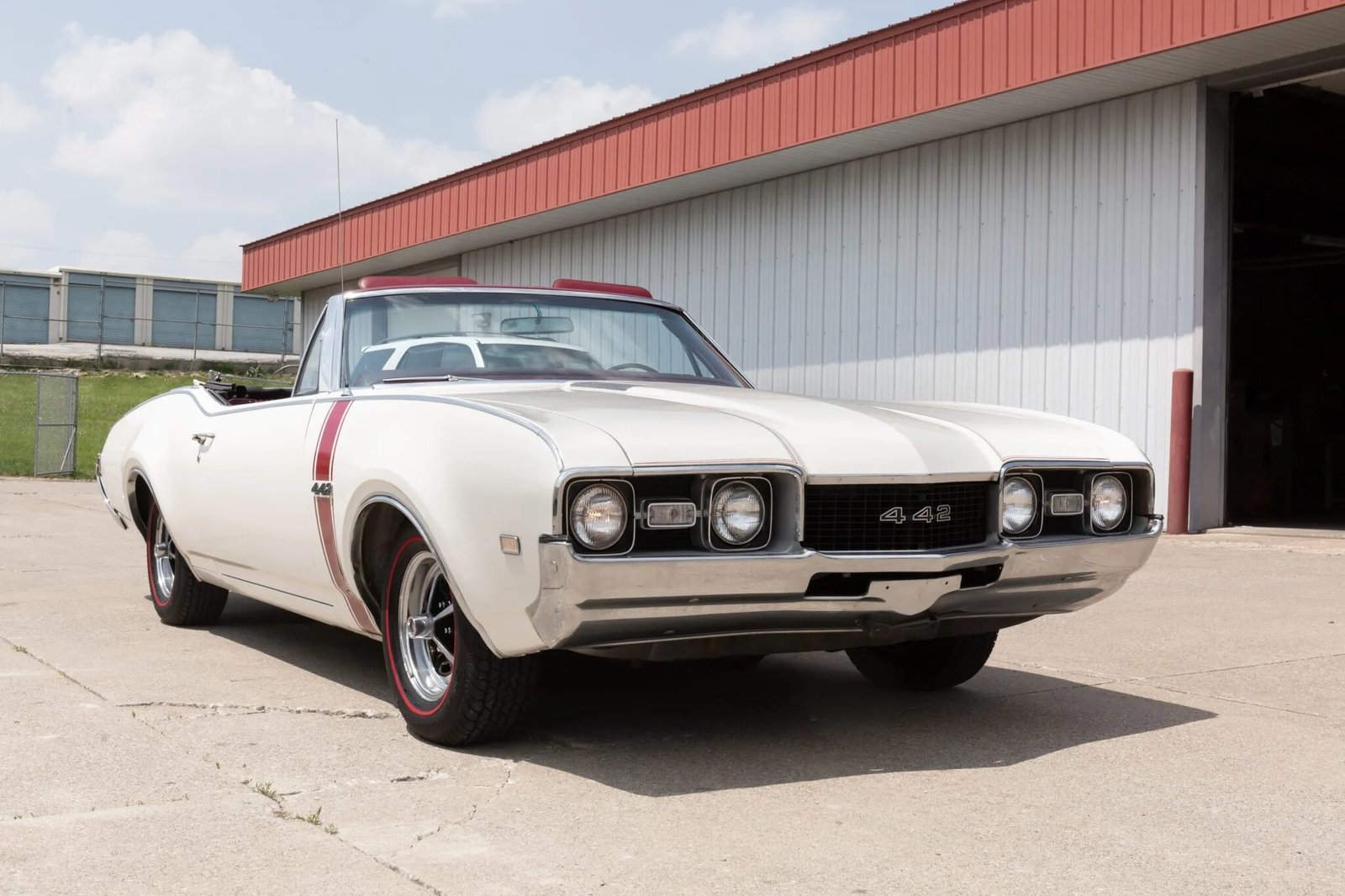 This 1968 Oldsmobile 442 convertible is finished in white over red and powered by a 400ci V8 paired with a TH400 three-speed automatic transmission.