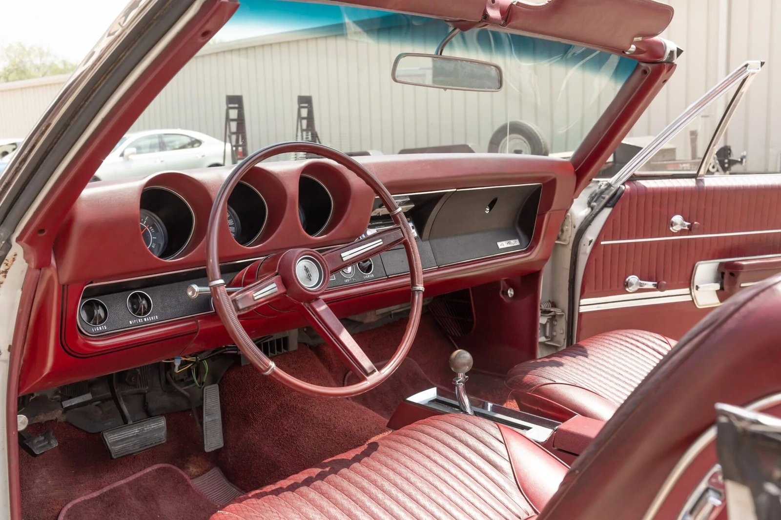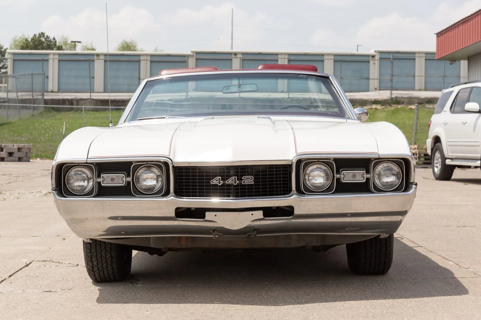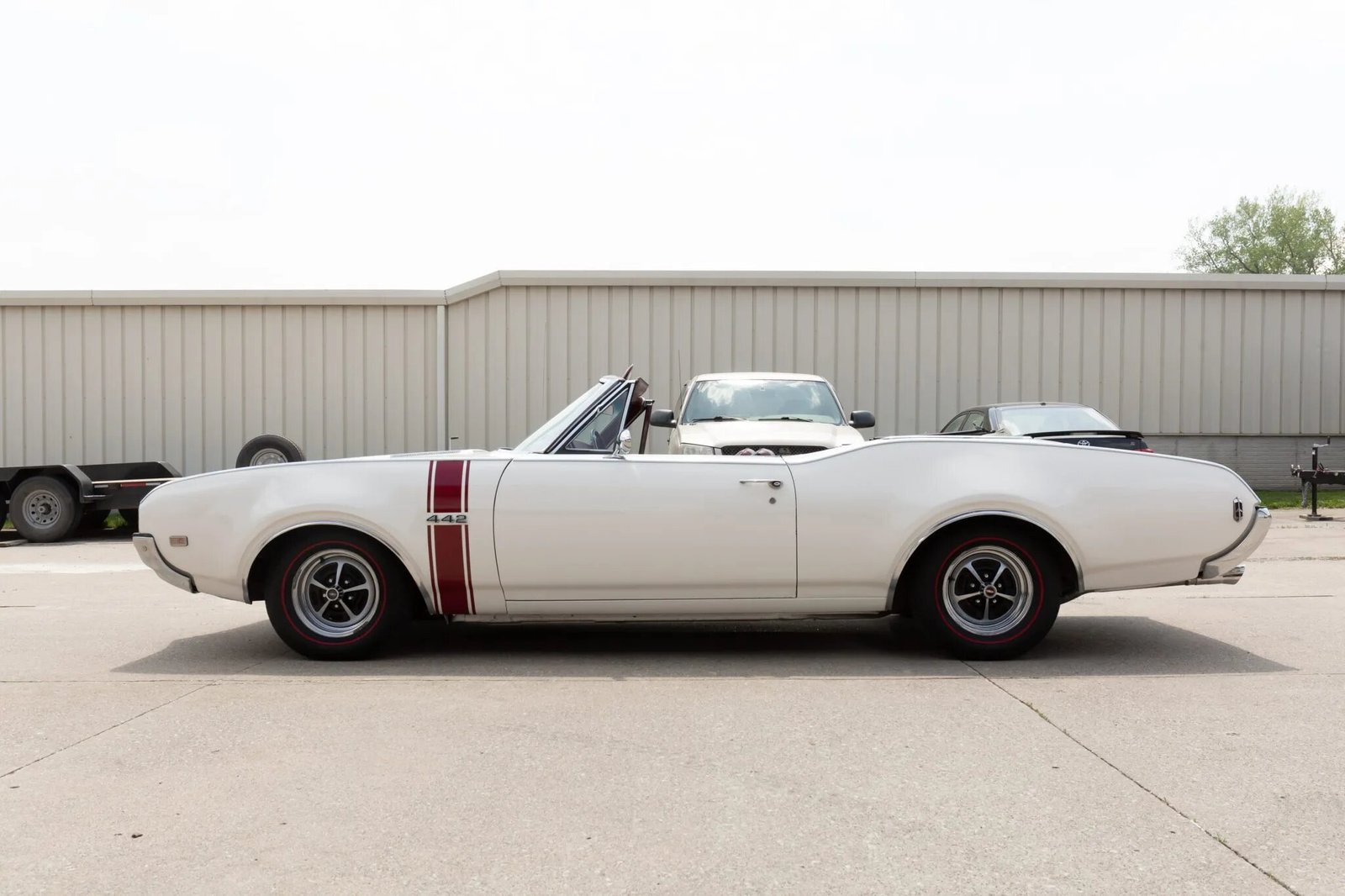This 1968 Oldsmobile 442 convertible is finished in white over red and powered by a 400ci V8 paired with a TH400 three-speed automatic transmission.