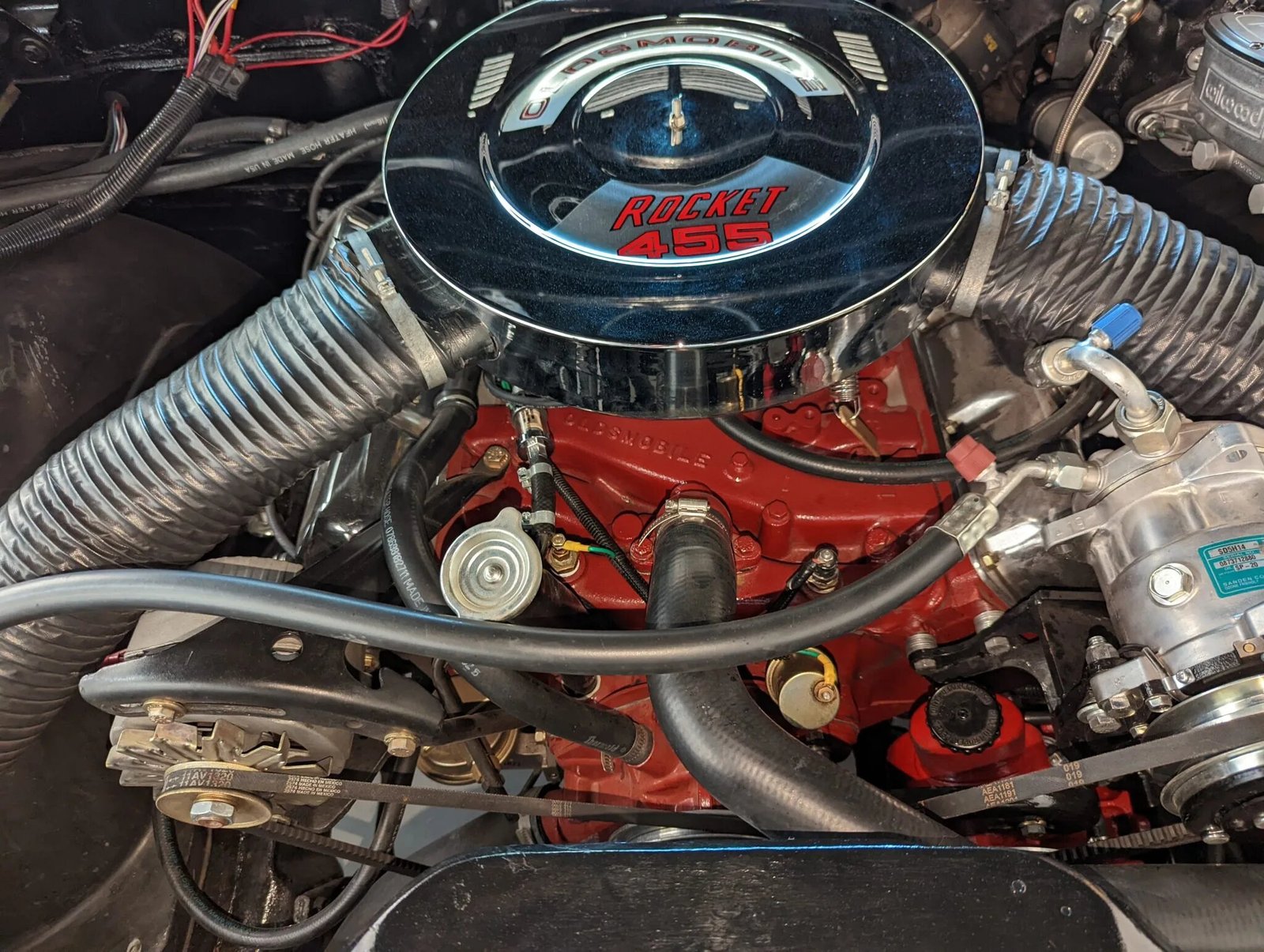 The replacement 459ci V8 was built by Duffee Motorsports of Arizona and breathes through an Edelbrock Performer 750 CFM carburetor.