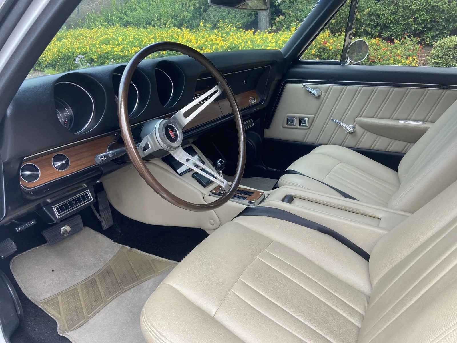 Replacement tan upholstery with pleated accents covers the front bucket seats, rear bench, and door panel inserts.