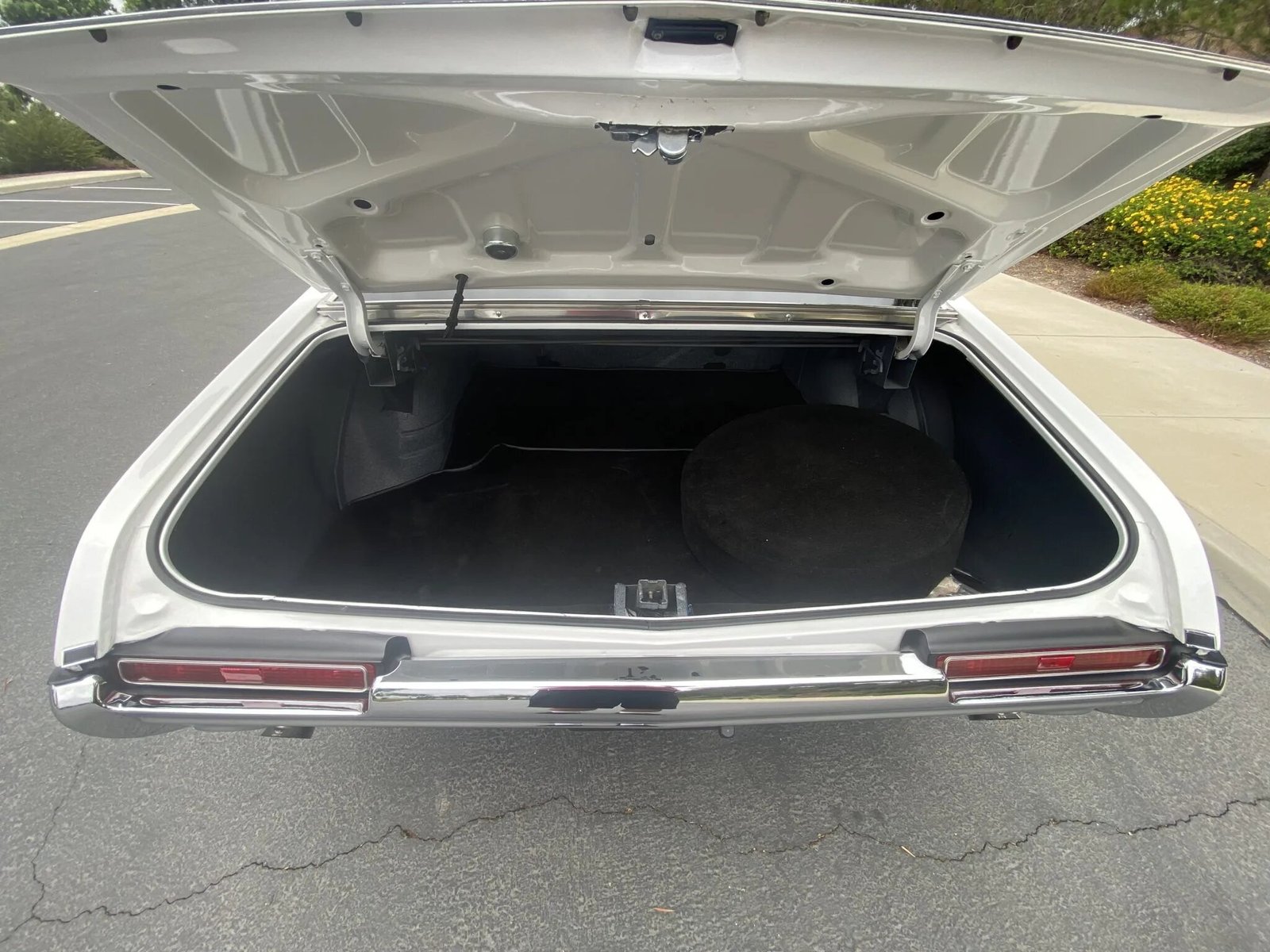 The trunk features matching black carpet fitted over a spray-on bedliner application.