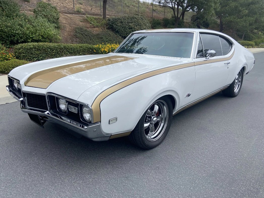 Features include painted metallic gold accents, dual mirrors, tinted windows, and Hurst badging on the front fenders and trunklid.