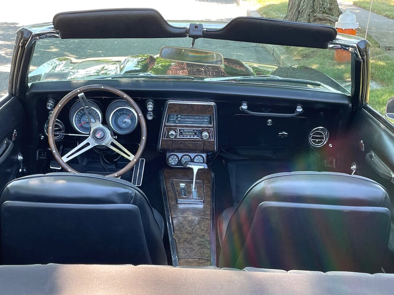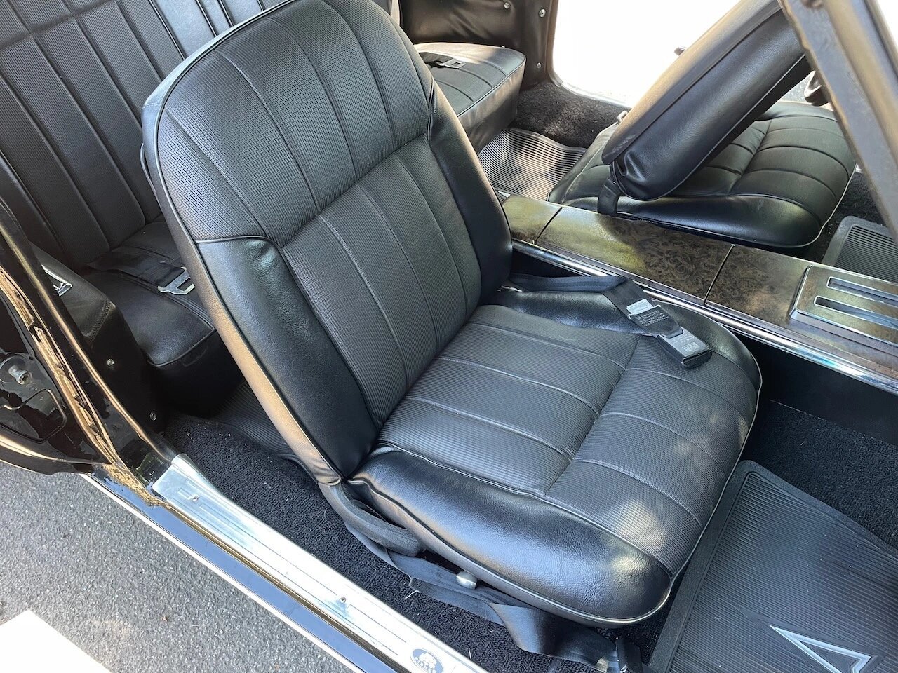 Equipment includes a retro-style radio, woodgrain trim, front and rear lap belts, and a passenger grab bar.