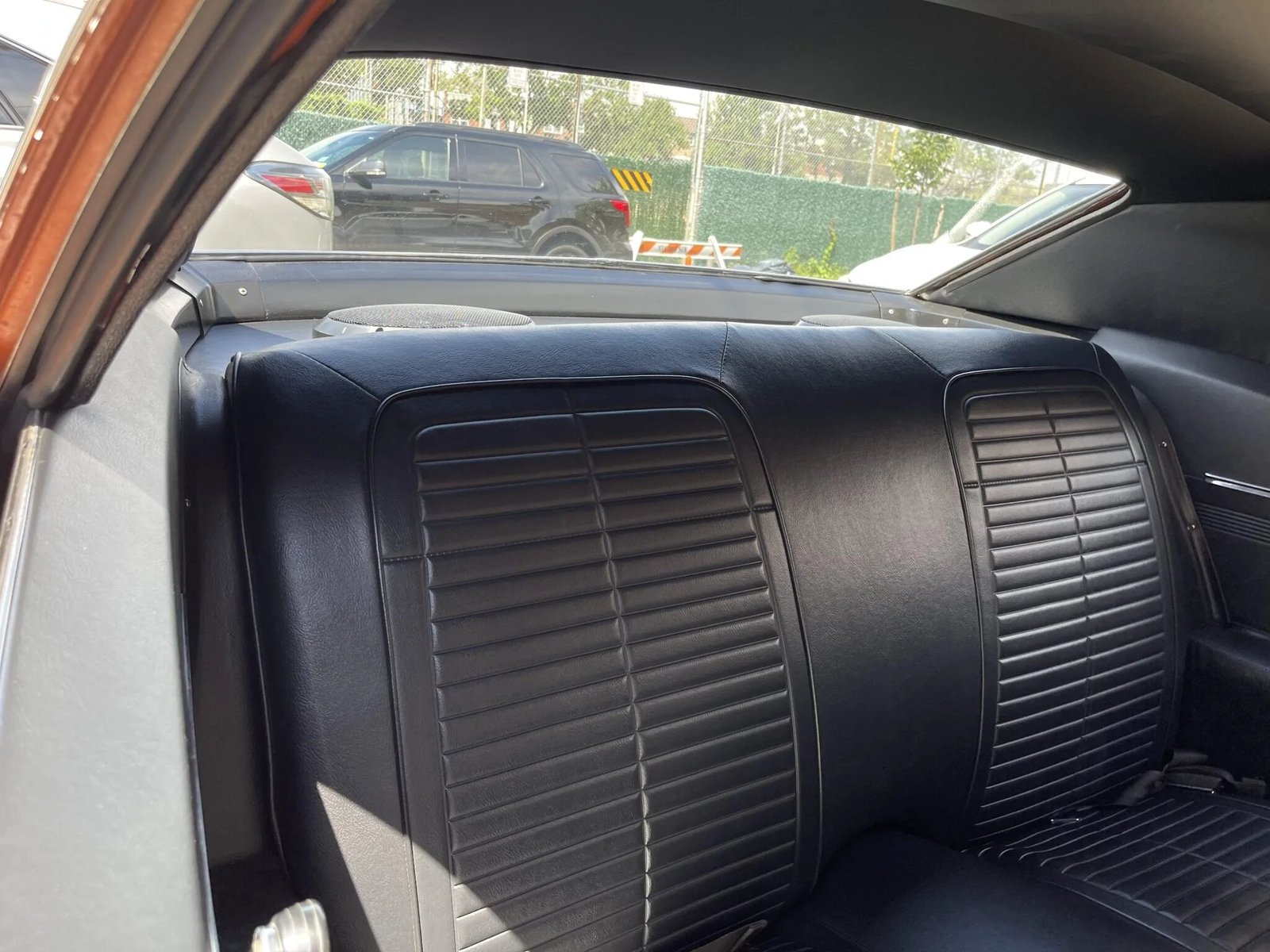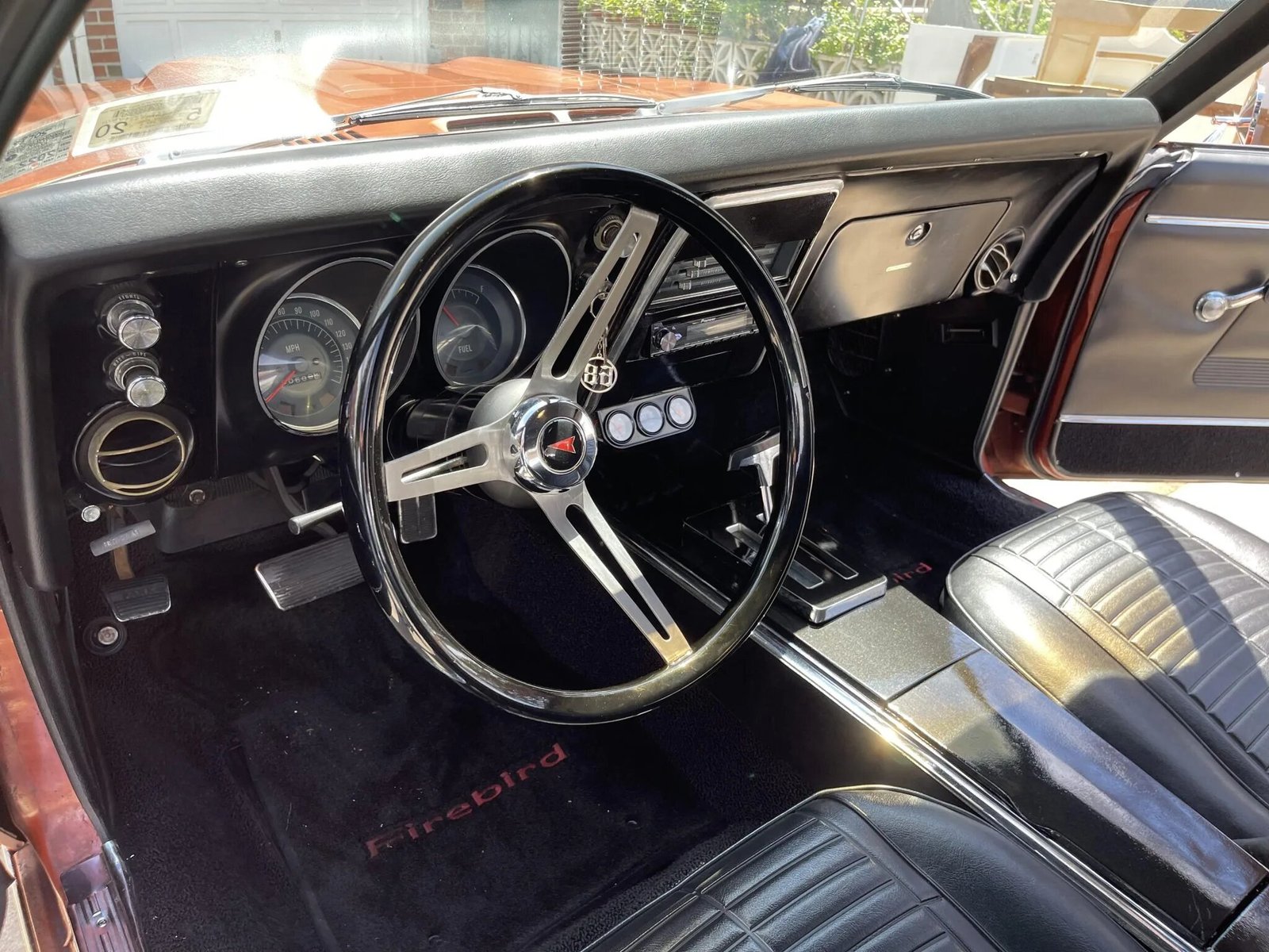 The replacement three-spoke steering wheel sits ahead of aftermarket instrumentation consisting of a 160-mph speedometer and a fuel level gauge.