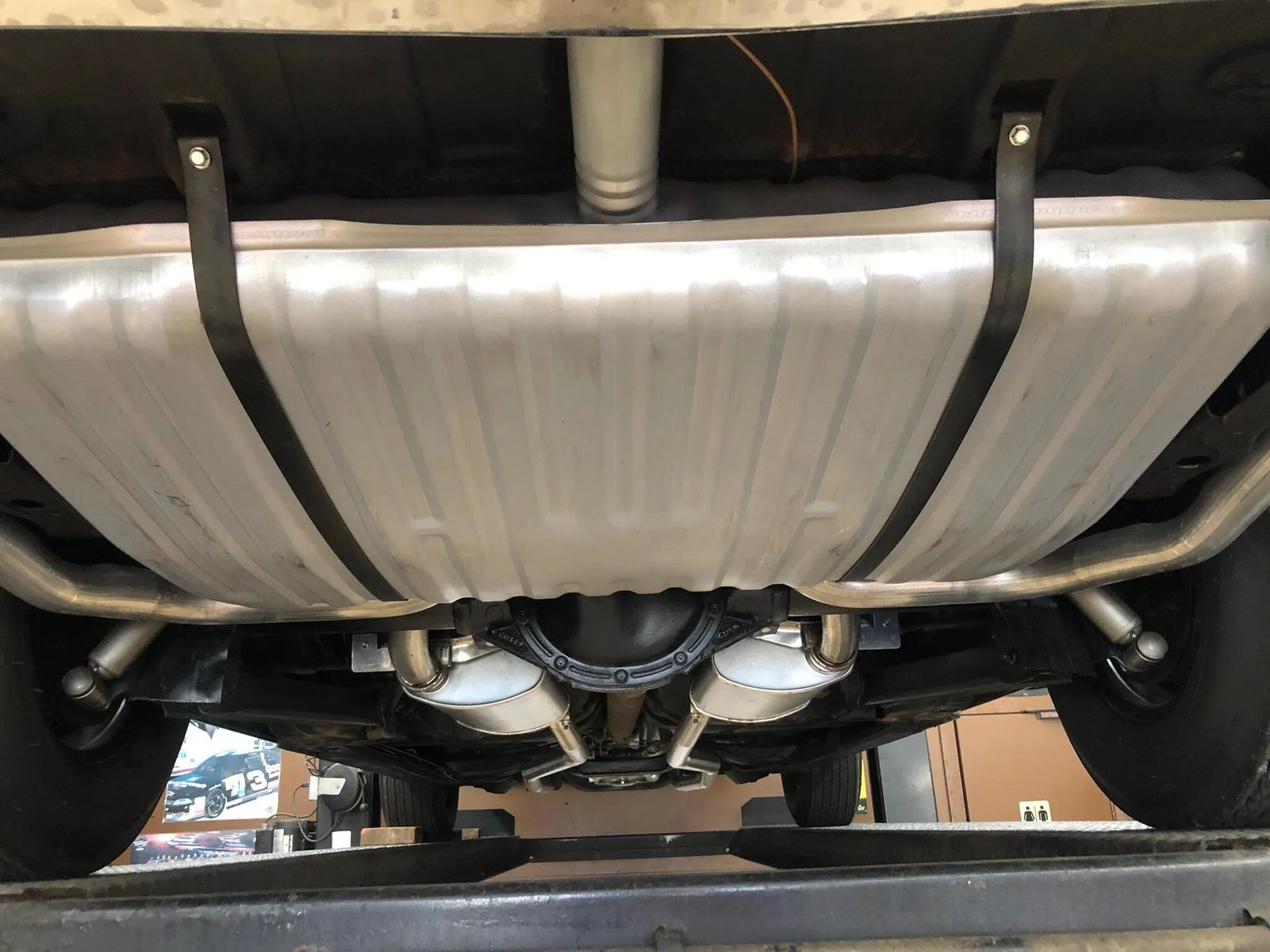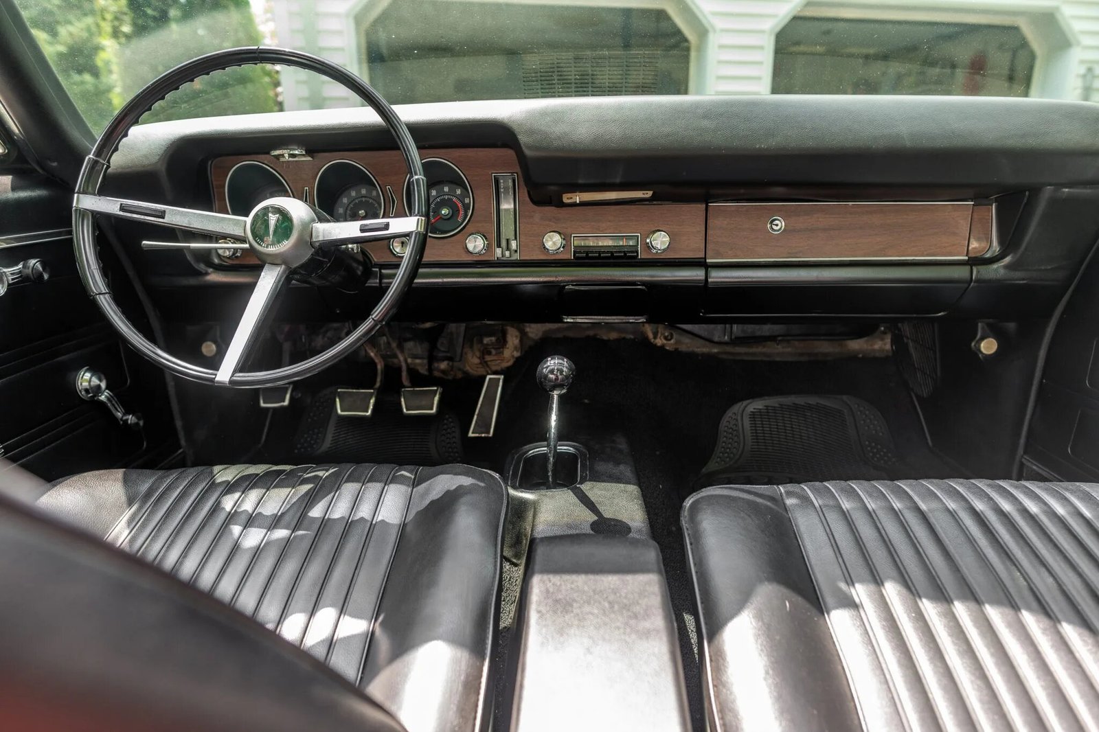 Features include a center console, Hurst shift lever, faux woodgrain trim accents, polished door sills, lap belts, and a push-button AM Radio.