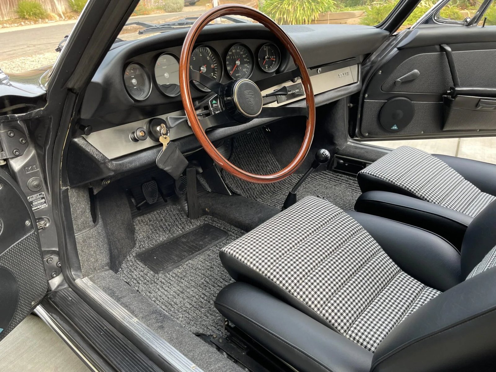 Recaro sport seats were fitted with replacement foam padding and reupholstered in black vinyl with Pepita cloth inserts sourced from Autos International.