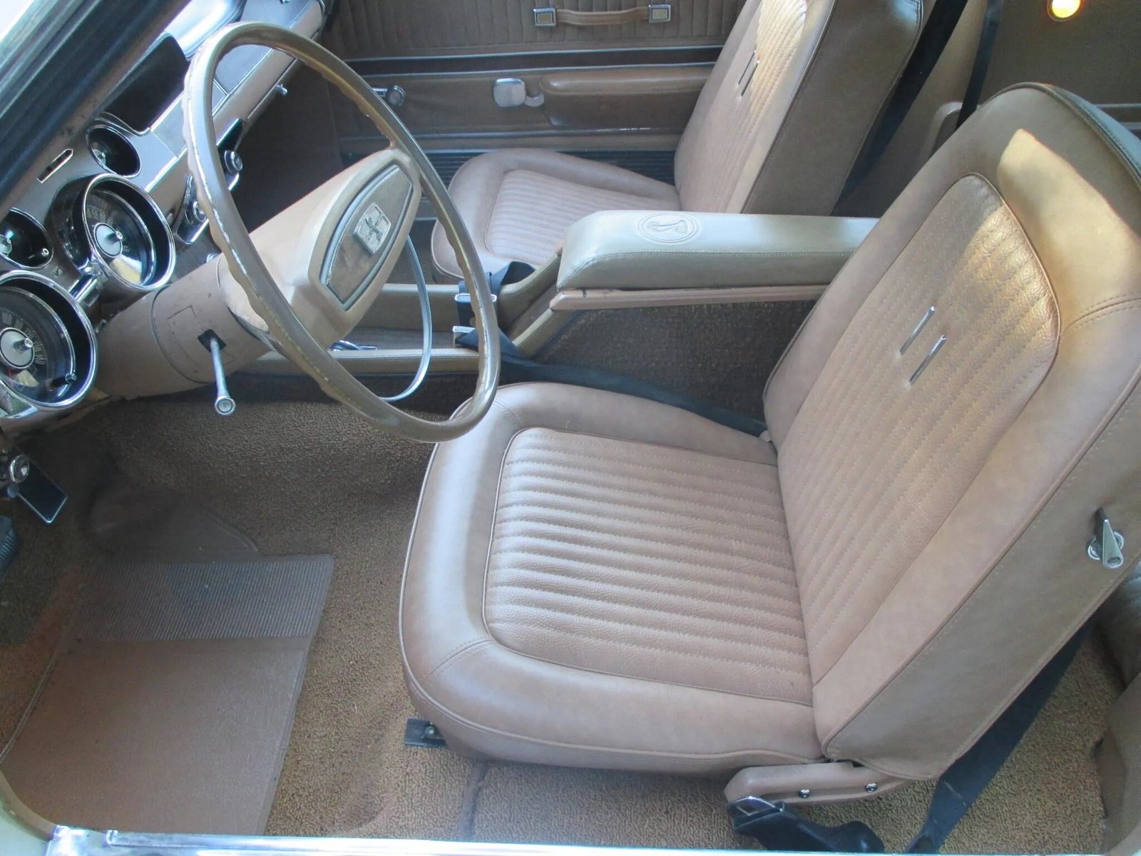 The cabin features front bucket seats and a fold-down rear bench seat covered in Saddle vinyl. The Interior Décor Group added woodgrain trim to the dashboard, door panels, and center and overhead consoles, while the Visibility Group package included under-dashboard courtesy lights and illumination in the glovebox, trunk, and engine compartment, along with a glovebox lock. A roll bar with inertia-reel seatbelts was standard in Shelby cars.