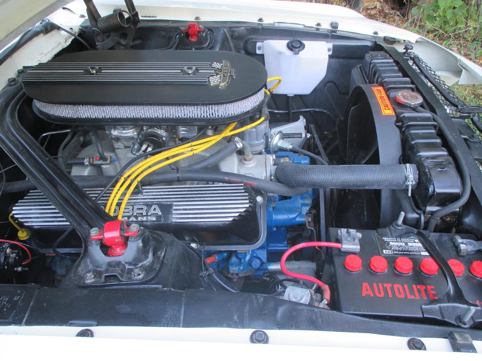The GT500 was equipped from the factory with a ducktail rear spoiler, fender extensions, air scoops on the sail and quarter panels, and a fiberglass ventilated hood with a ram-air scoop. This example have been repainted in its factory Wimbledon White (M) during the 1990s refurbishment and features grille-mounted high-beam lamps, twist hood locks, blue bodyside stripes, a driver-side mirror, a quarter panel-mounted antenna, reverse lamps, and dual exhaust outlets exiting below the rear valance. A set of SEV Marchal fog light covers are included in the sale.