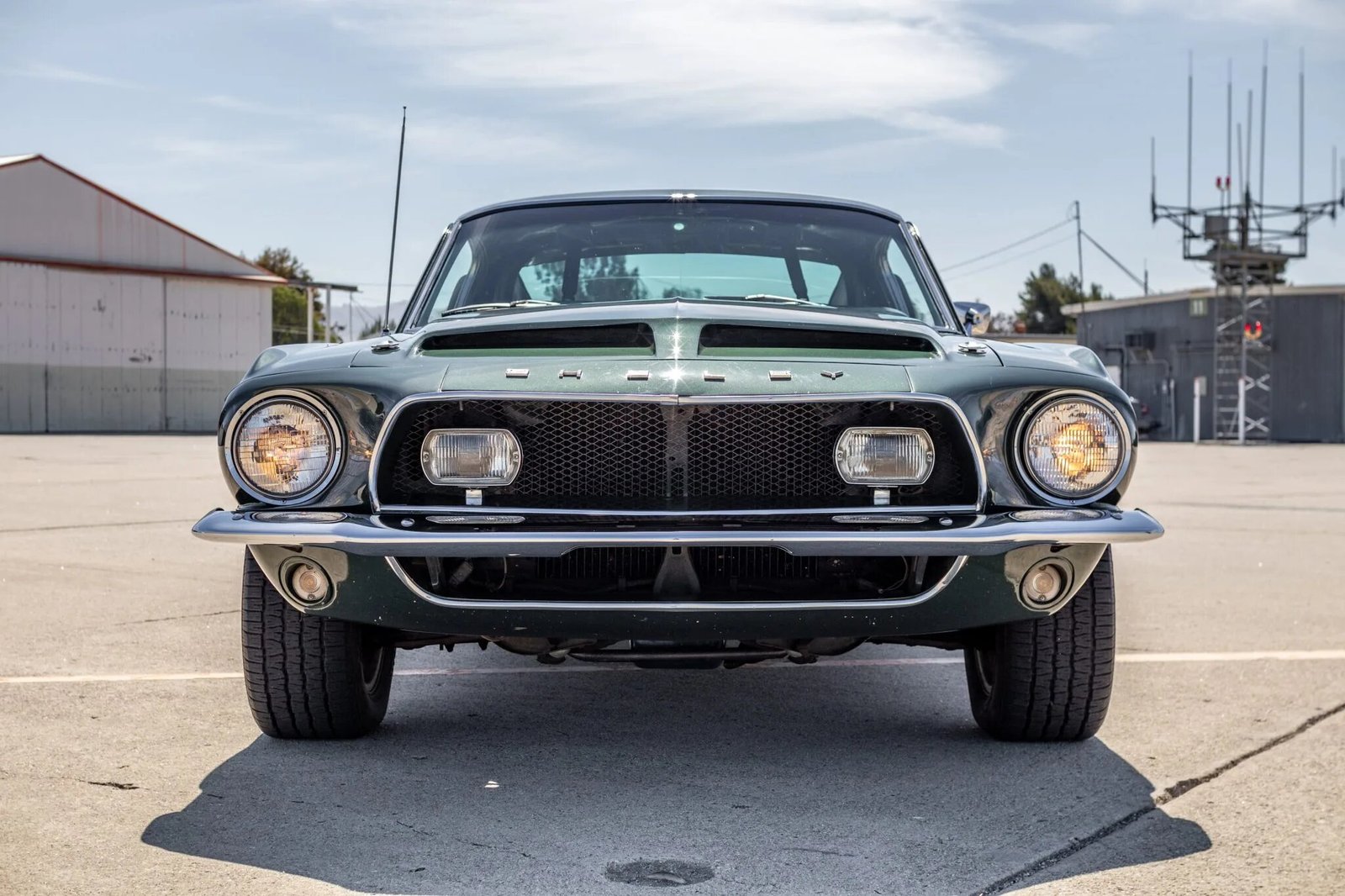 The car was delivered new in Highland Green and features a ventilated fiberglass hood with a ram-air scoop, side and quarter scoops, rocker-panel stripes, an integrated rear spoiler, and Shelby badging.