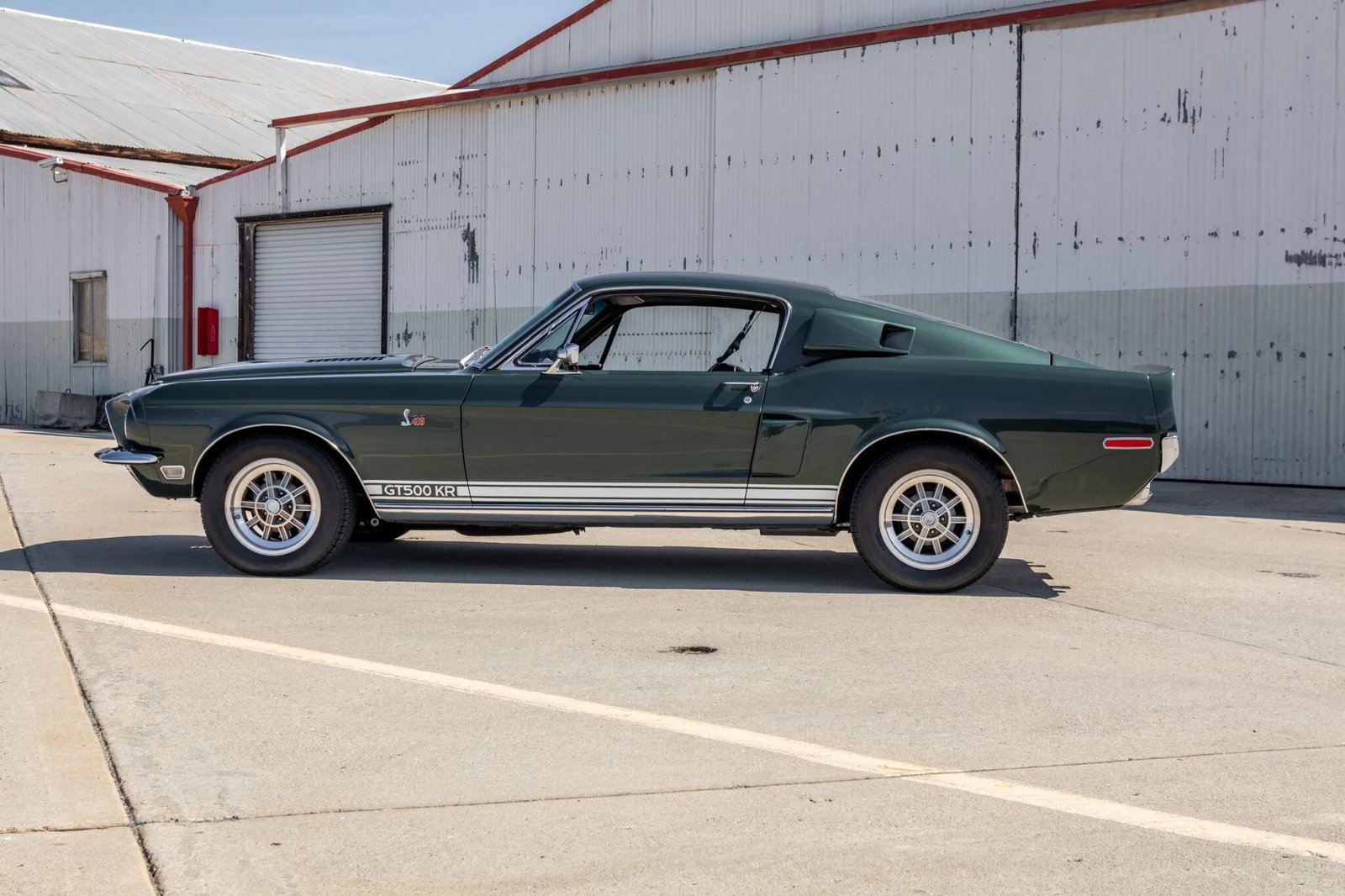 This 1968 Shelby Mustang GT500KR fastback is one of 1,053 examples produced during a production run from April through July 1968. The car was delivered new to McCollum Motors of Dishman, Washington finished in Highland Green over black with GT equipment, and it is powered by a 428ci Cobra Jet V8 paired with a four-speed manual transmission and a 9″ rear axle with a limited-slip differential. Other features include a twin-scoop hood, side scoops, a rear spoiler, 15″ wheels, power-assisted steering and front disc brakes, Koni shocks, and a Philco push-button radio.