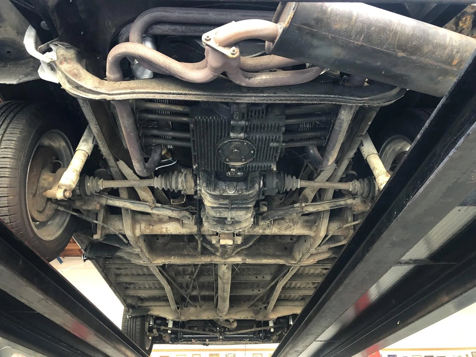 Polished foot pedals and an EMPI gearshift lever have been installed.