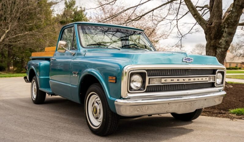 This 1969 Chevrolet C10 pickup is finished in blue over blue and powered by a 5.3-liter Vortec V8 paired with a 4L60E four-speed automatic transmission.