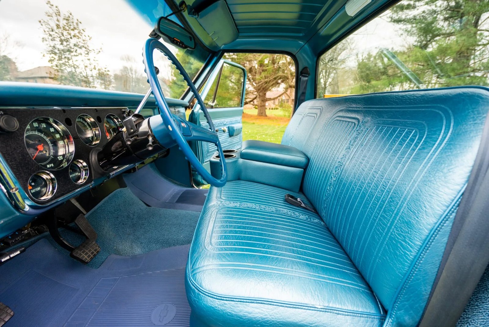 The standard cab features bench seating reupholstered in blue vinyl with a matching dashboard, door panels, and carpets.