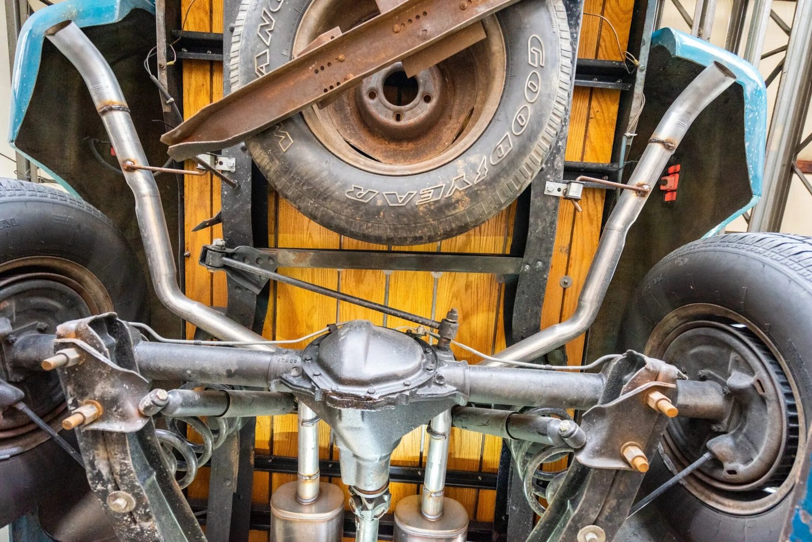 A spare tire is mounted beneath the bed.