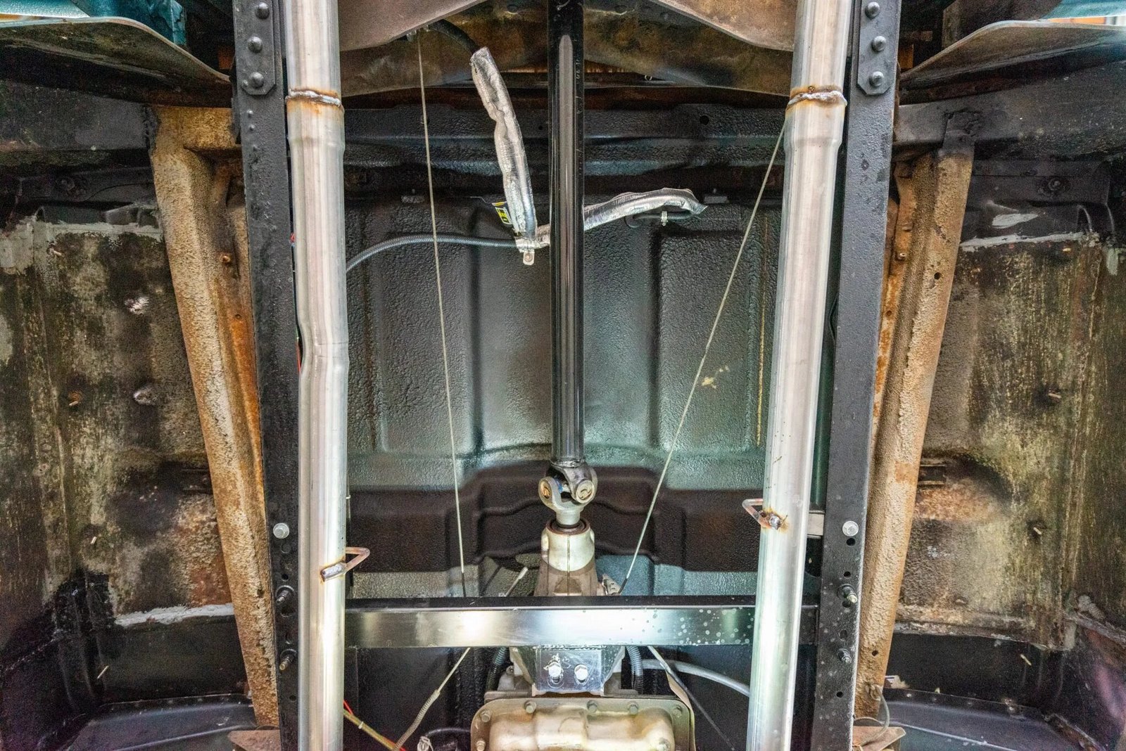 A front cross member sourced from a 1987 Chevrolet pickup is reportedly installed and features power steering along with power disc brakes.