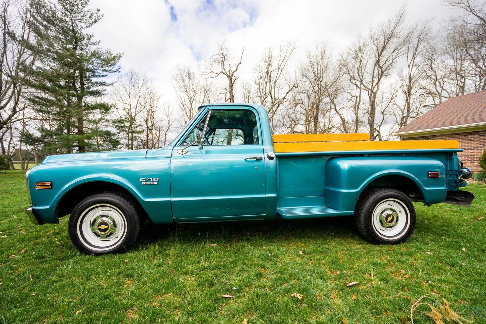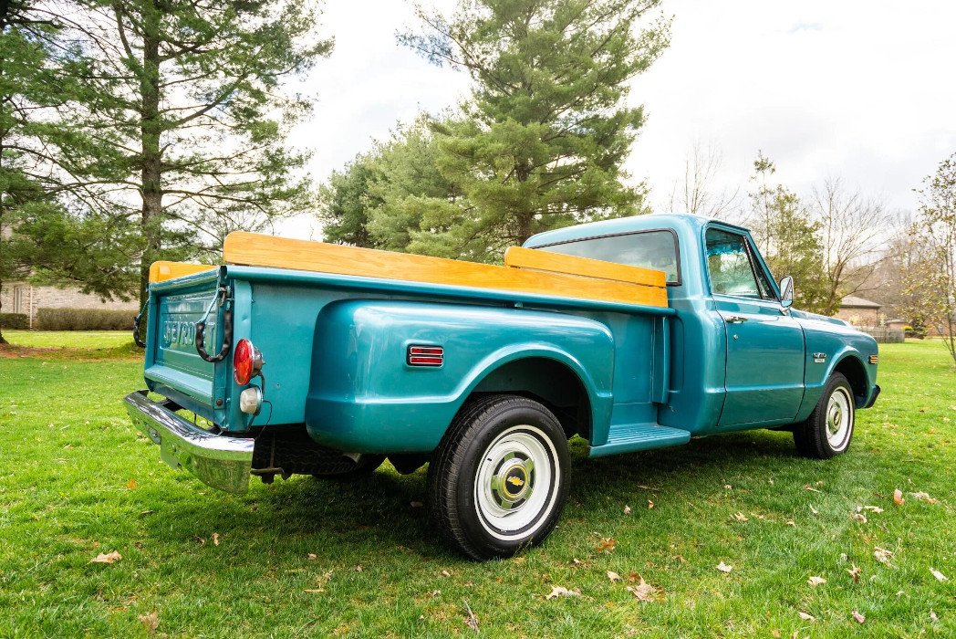 Additional equipment includes side mirrors, C10 badging, a removable rubber bed liner, and a dual exhaust system routed through Trailblazer SS-sourced mufflers.
