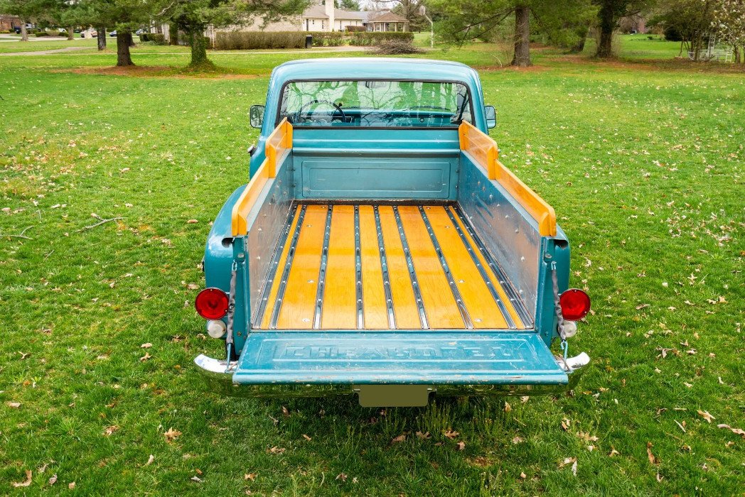 Fiberglass stepside rear quarter panels were installed and replacement fenders, fender liners, cab corners, rocker panels, and floor panels were fitted before the truck was repainted in blue.