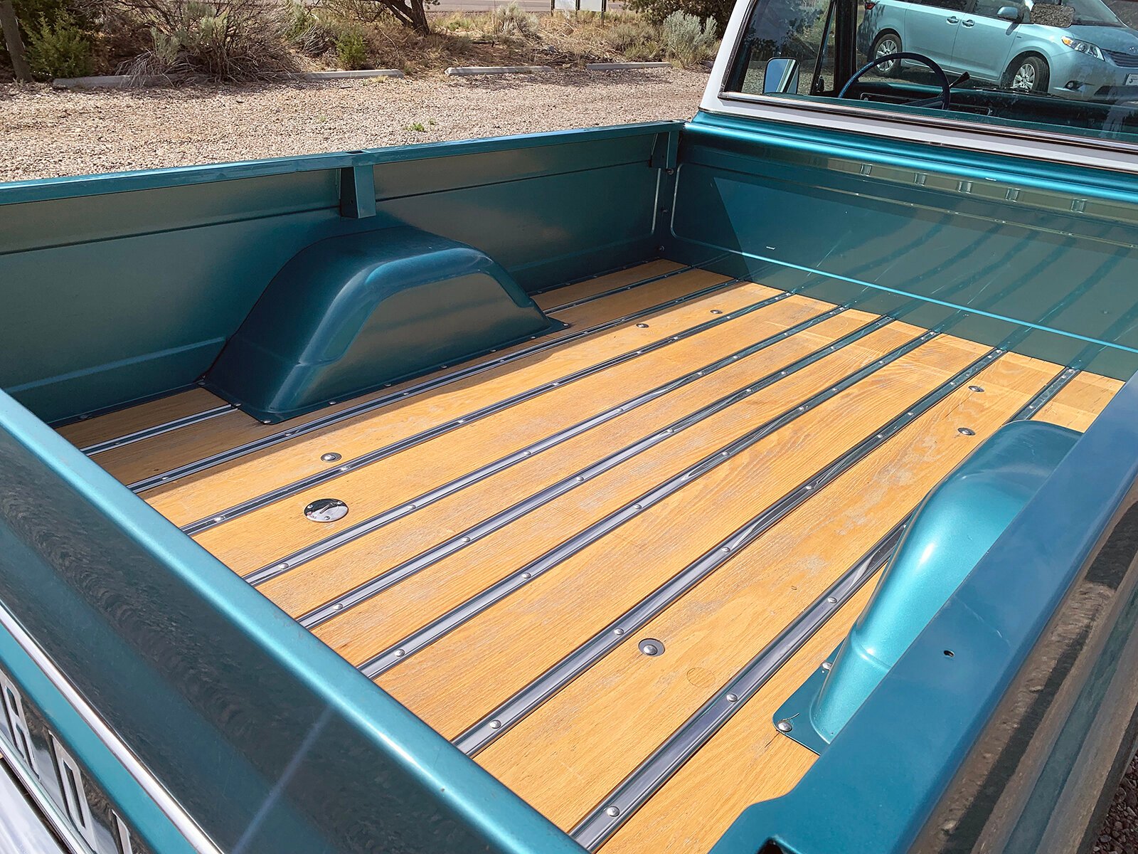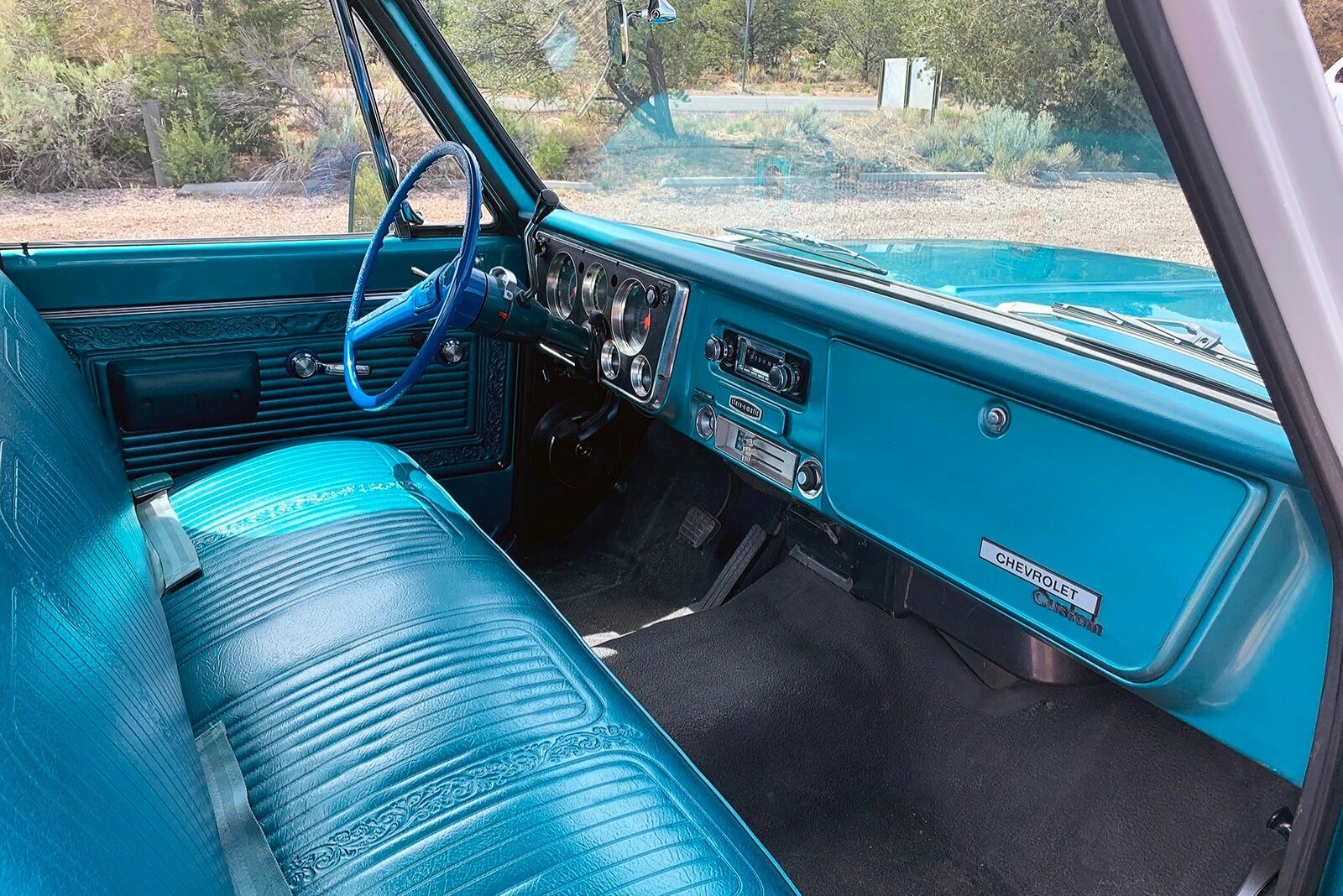 The cab features a bench seat upholstered in turquoise vinyl and joined by a matching dashboard and door panels.