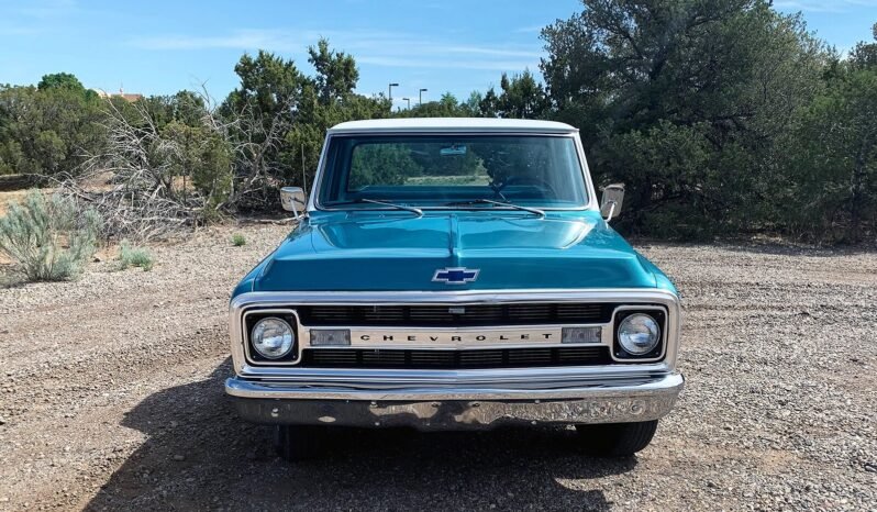 The truck is finished in two-tone turquoise and white over turquoise vinyl upholstery and is powered by a 396ci V8 paired with a three-speed automatic transmission.