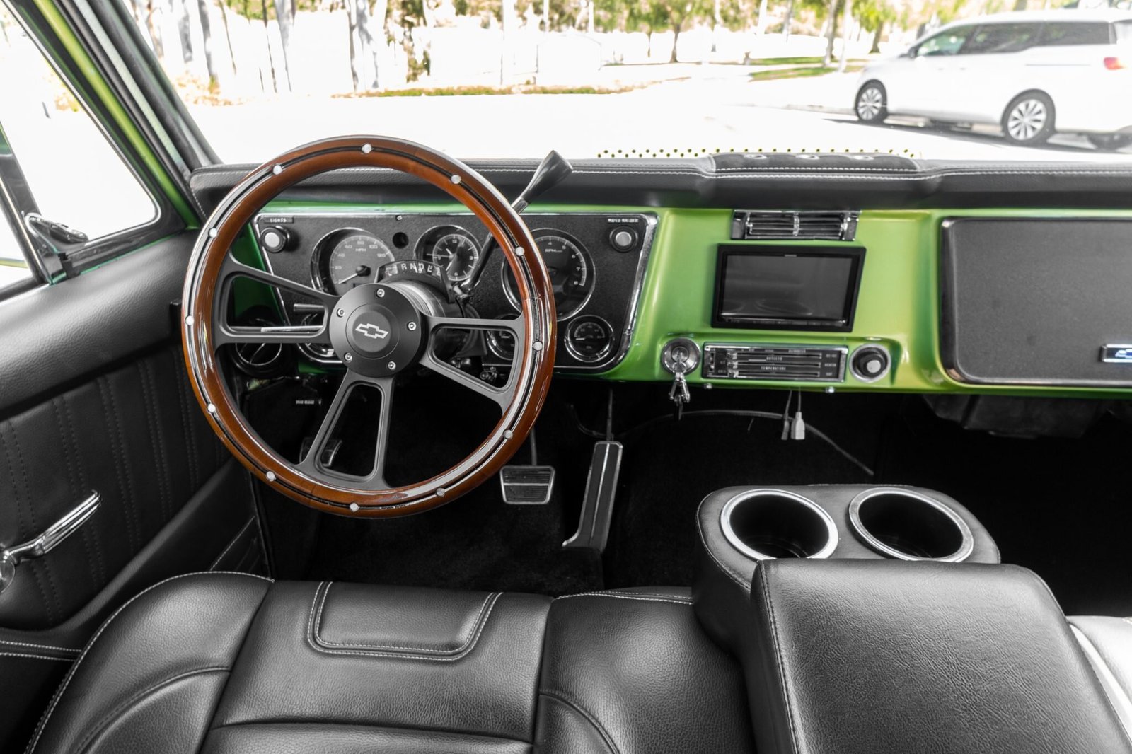 The wood-rimmed steering wheel is mounted on a rebuilt tilt column and frames Dakota Digital instrumentation that includes a 160-mph speedometer, an 8k-rpm tachometer, an analog clock, and auxiliary gauges that measure oil pressure, coolant temperature, voltage, and fuel level.