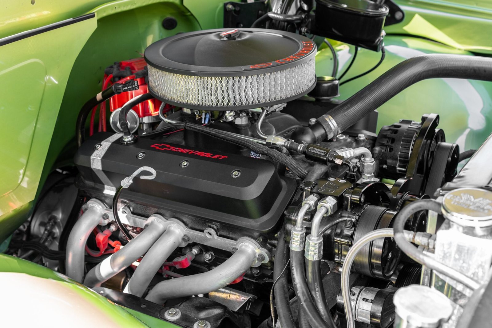 The factory V8 has been replaced by a carbureted 350ci V8 crate engine that features tubular headers, a dual exhaust, a Champion aluminum radiator with dual electric fans, a Painless Performance wiring harness and fuse box, and a rear-mounted aluminum fuel tank.