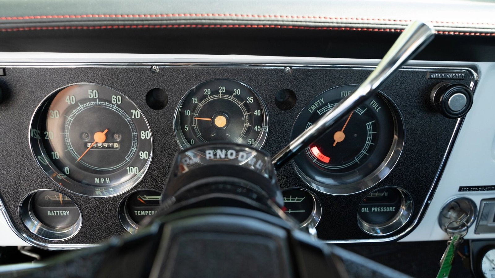 The cabin was refurbished with a black-trimmed bench seat with red stitching along with a matching dashboard pad, patterned door panels, and replacement black carpets.