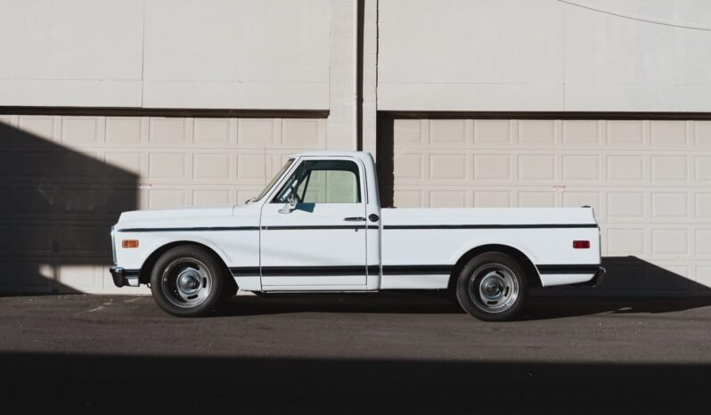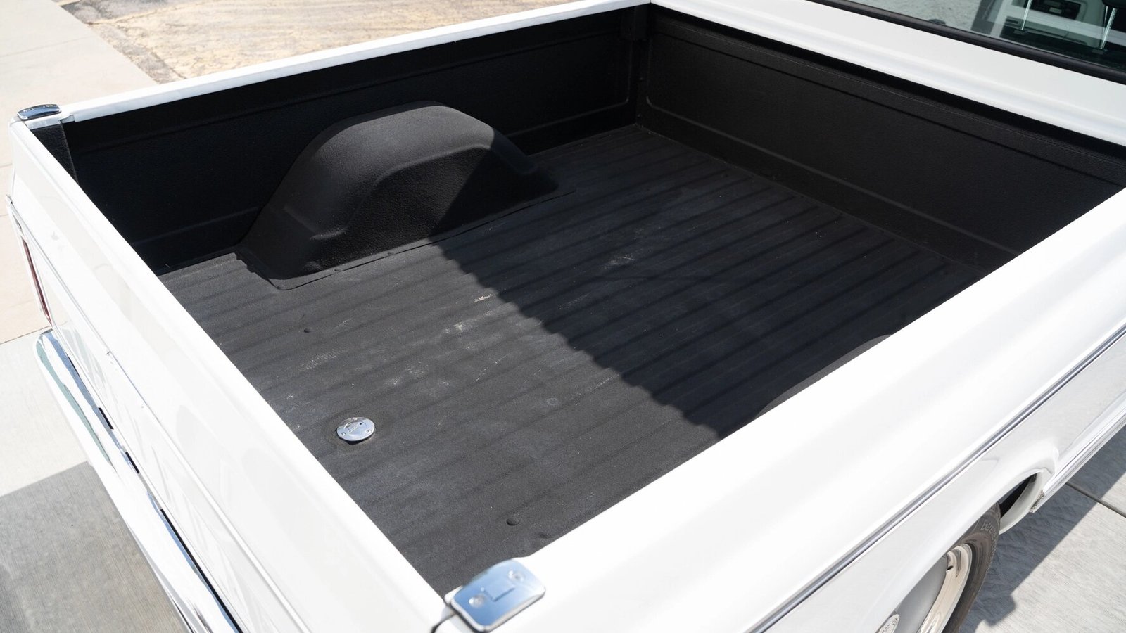 Work included removing the body from the frame and refinishing it in white, reupholstering the bench seat in black with contrasting red stitching, and installation of a 350ci V8 paired with a 700R4 four-speed automatic transmission.