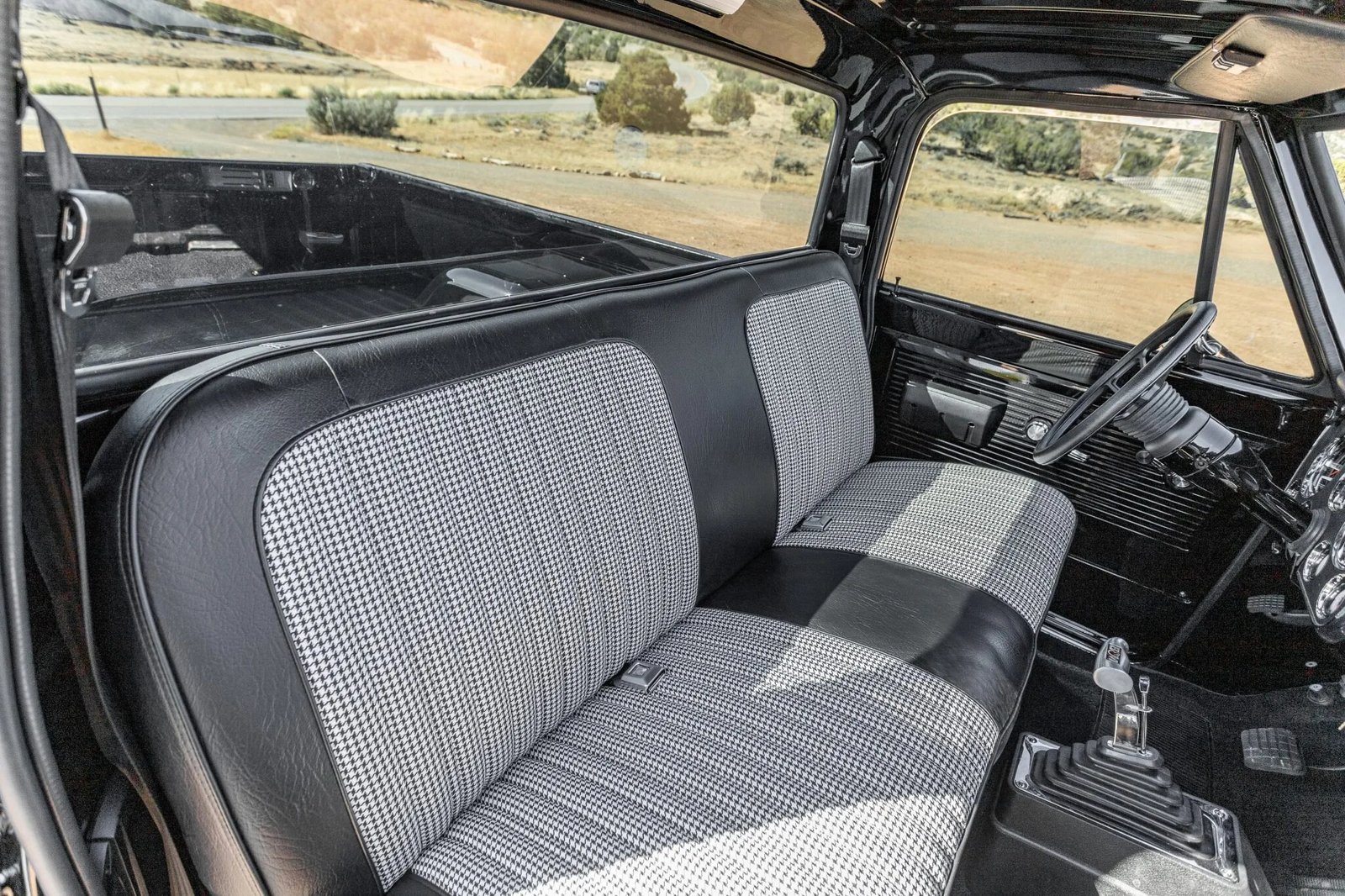 The bench seat was fitted with replacement upper and lower foam inserts before being reupholstered in black vinyl with houndstooth inserts.