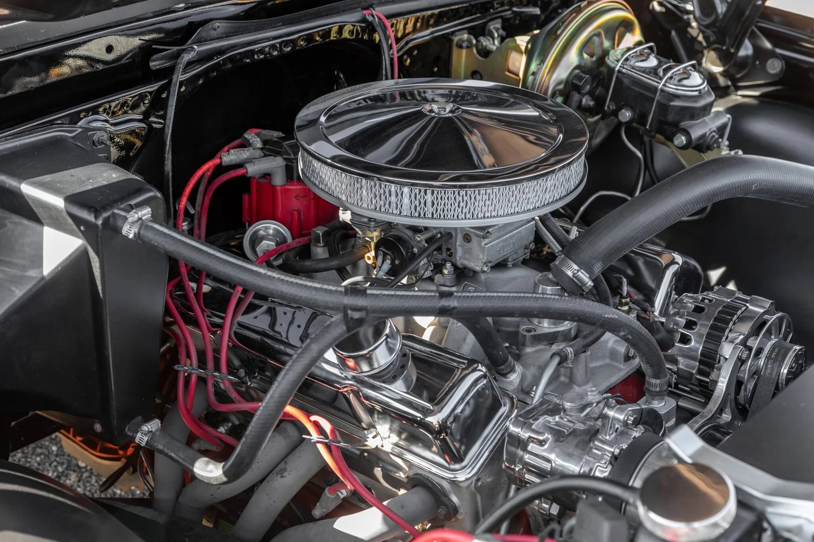 Subsequent work included metalwork followed by a repaint in black, reupholstery of the interior, and the installation of a 383ci V8 mated to a rebuilt TH400 three-speed automatic transmission.