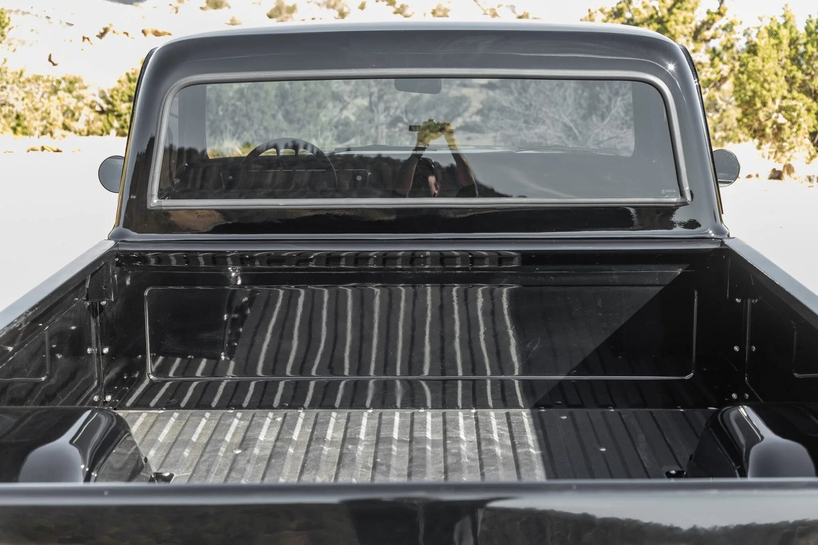 Bodywork ave included media-blasting the bed, cab, and doors along with installing a reproduction hood, inner and outer fenders, tailgate, core support, and grille as well as a replacement windshield and rear glass.