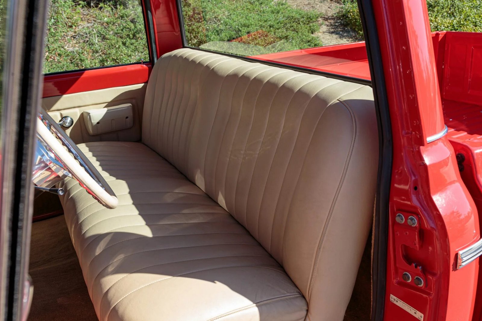 The cab features beige leather covering the bench seat, dashboard cover, and door panels as well as a matching finished headliner and matching carpets on the floors, behind the seat, and on the rear of the cab.